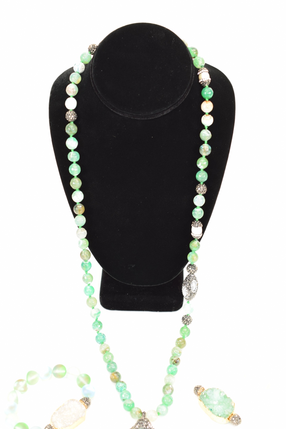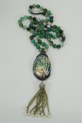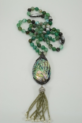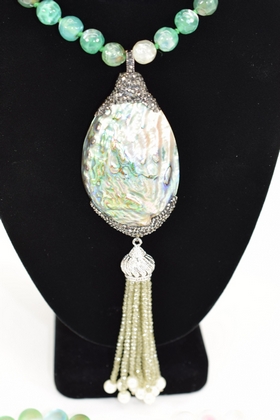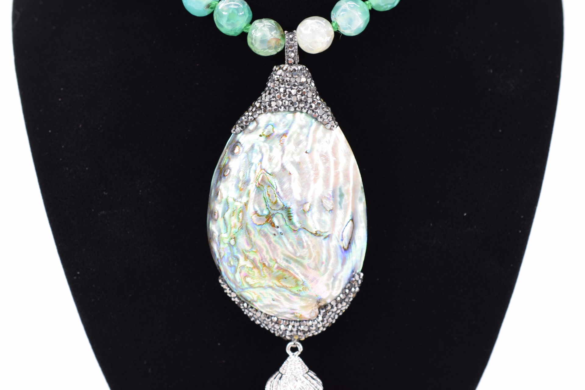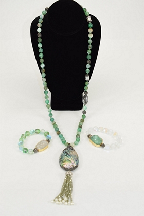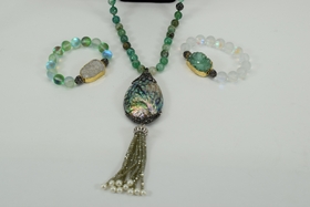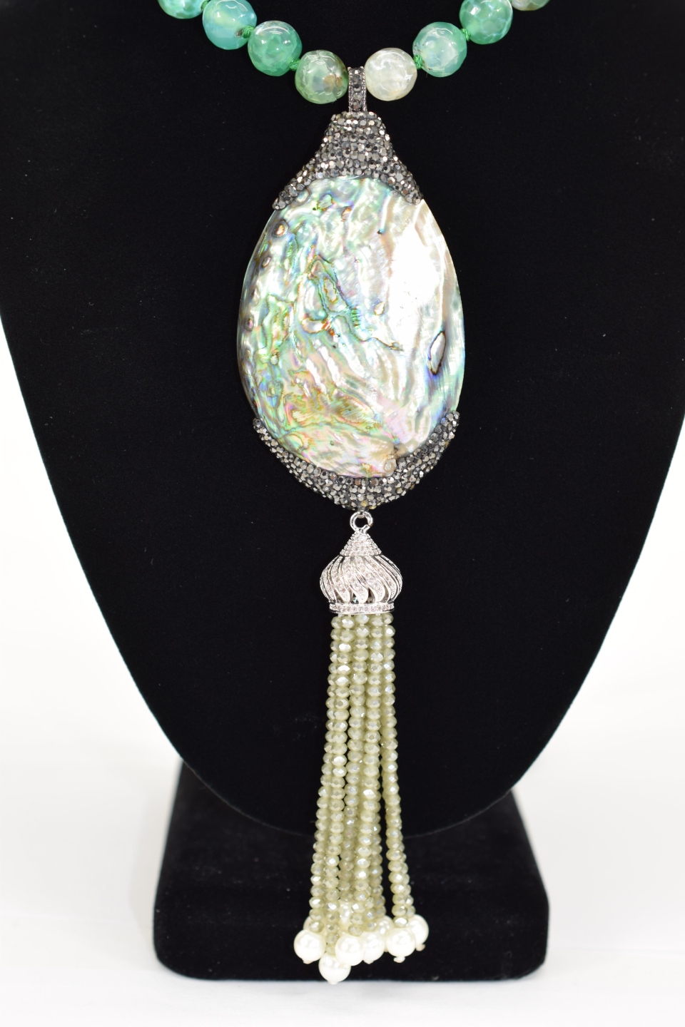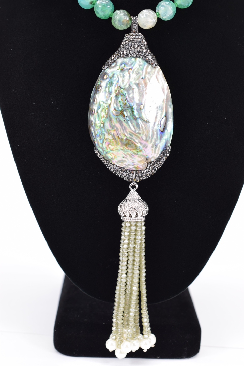 Green semiprecious stone necklace with abalone shell and rhinestone encrusted open-able pendant with dangling shimmery tassels. Included with 2 druzy geode iridescent beaded bracelets. Necklace measures 32” L (plus 6-3/4” L pendant). Bracelets approx. 7” L (not stretched). Weighs approx. 8oz. Total.