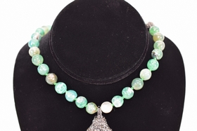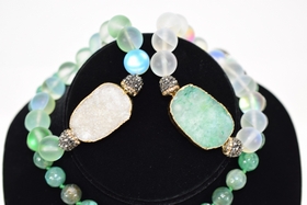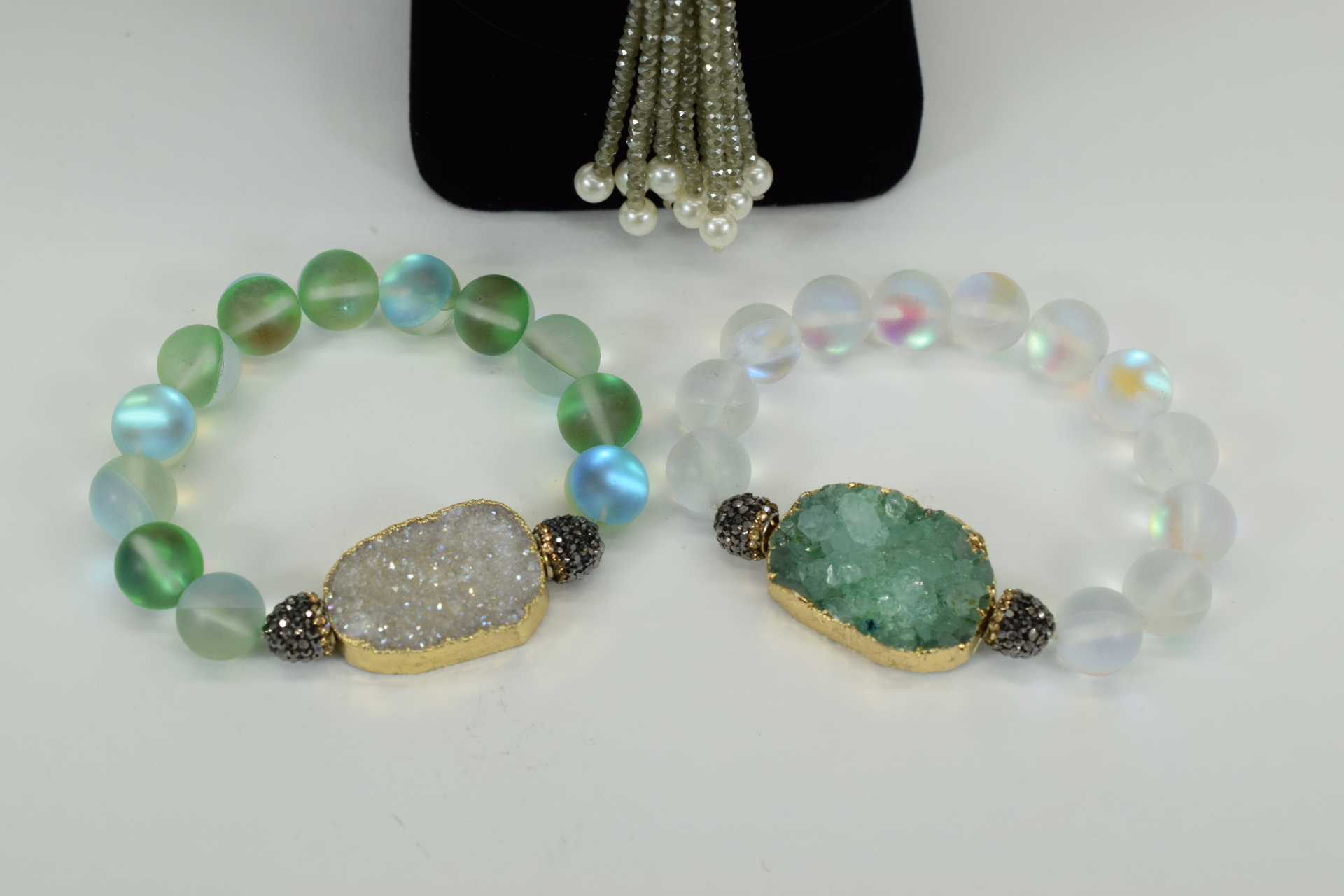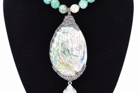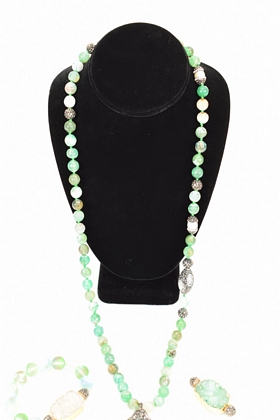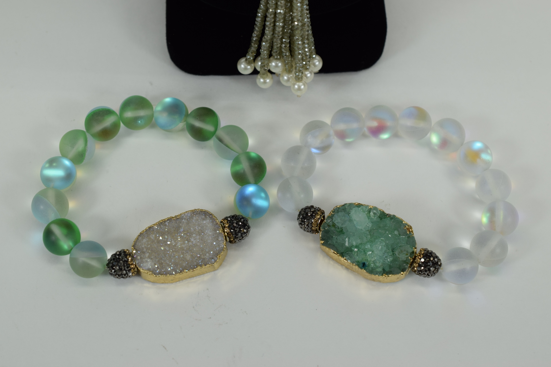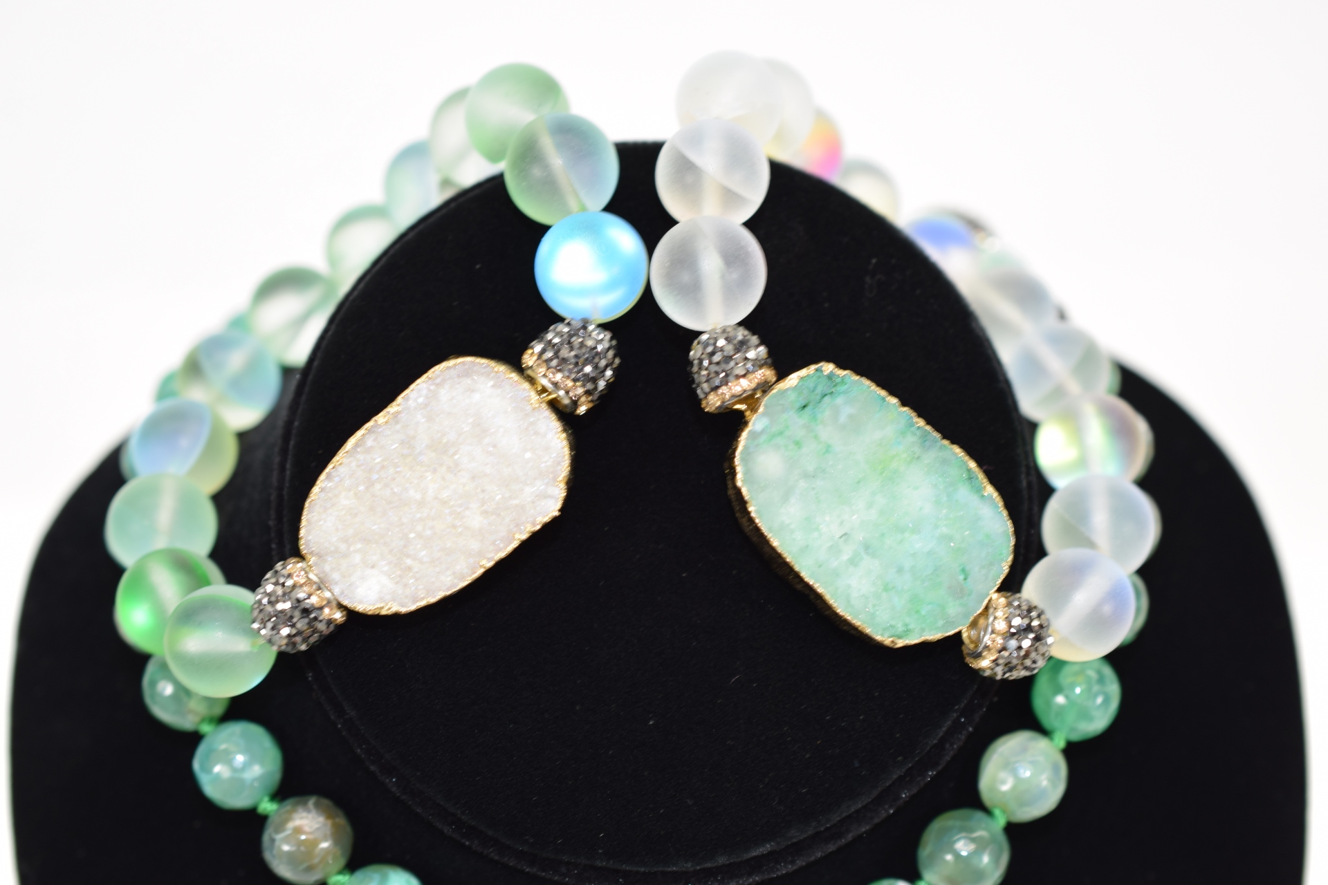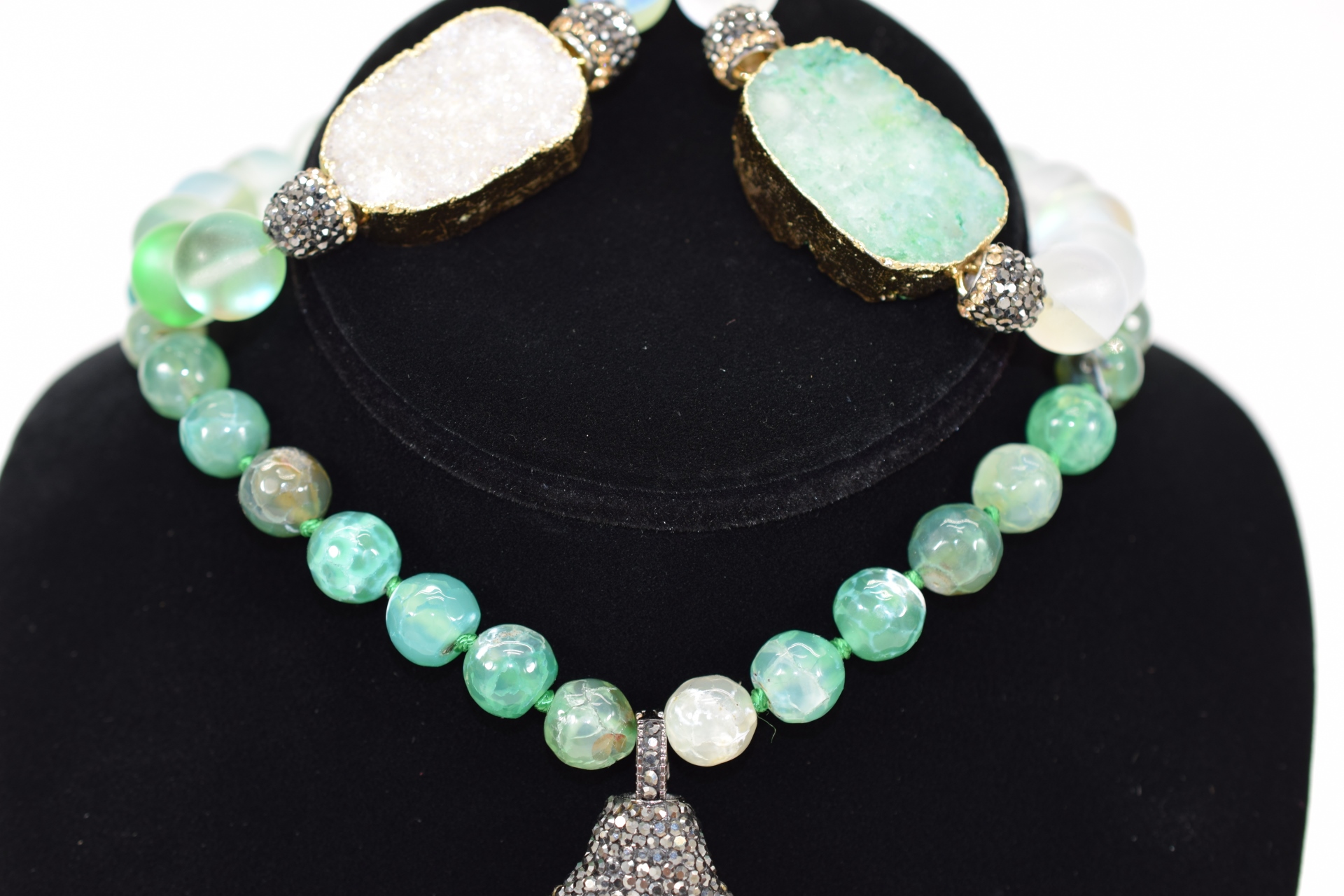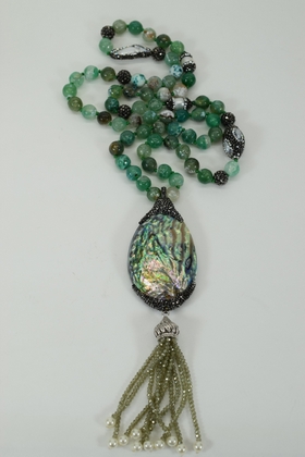 Green semiprecious stone necklace with abalone shell and rhinestone encrusted open-able pendant with dangling shimmery tassels. Included with 2 druzy geode iridescent beaded bracelets. Necklace measures 32” L (plus 6-3/4” L pendant). Bracelets approx. 7” L (not stretched). Weighs approx. 8oz. Total.