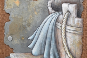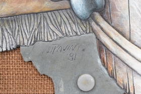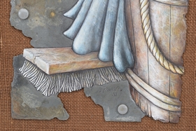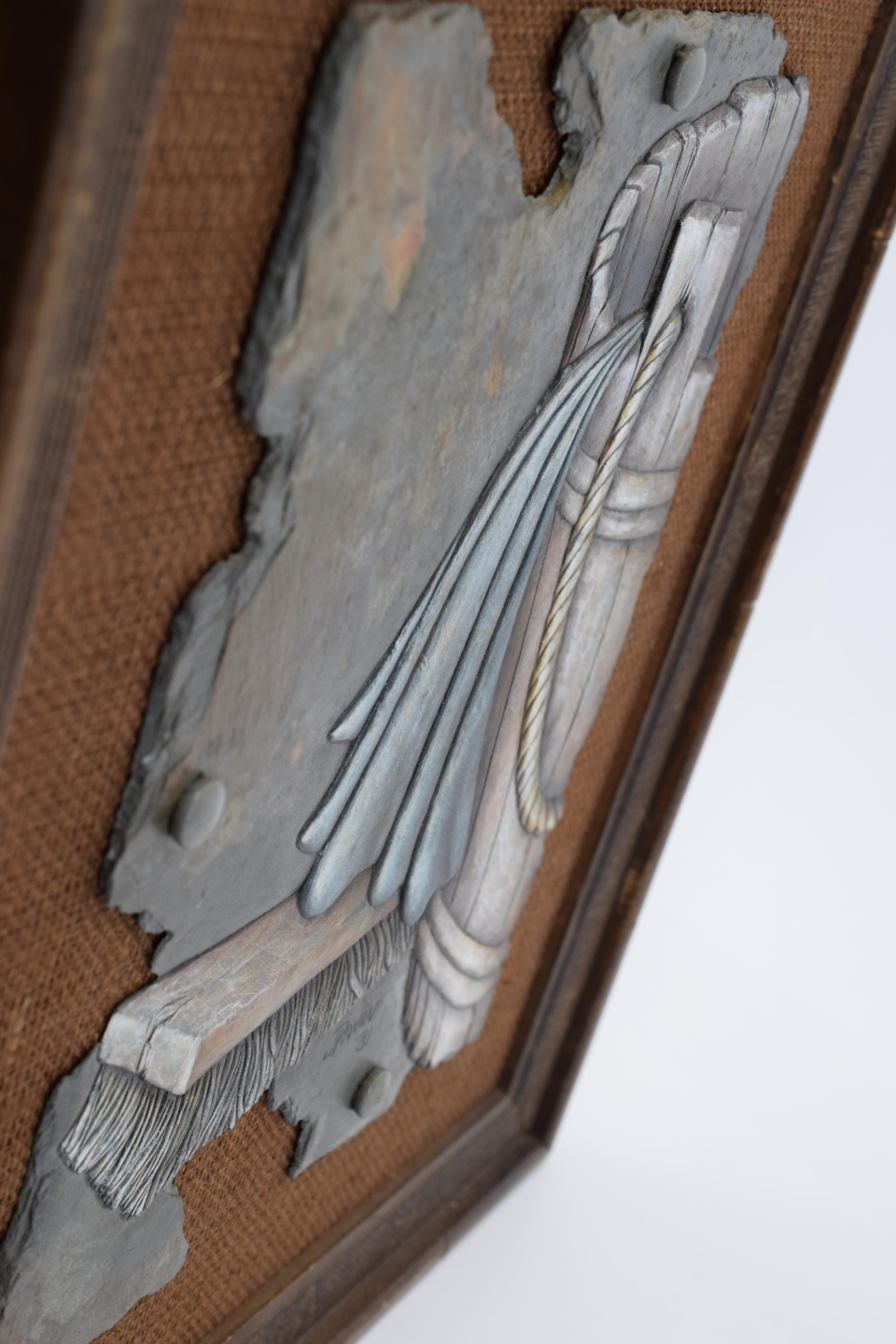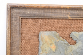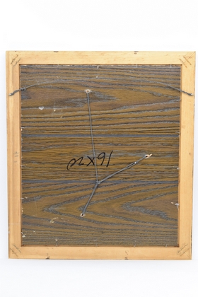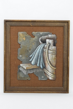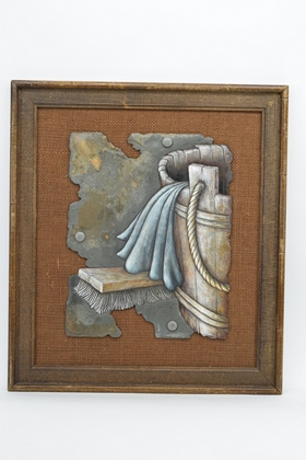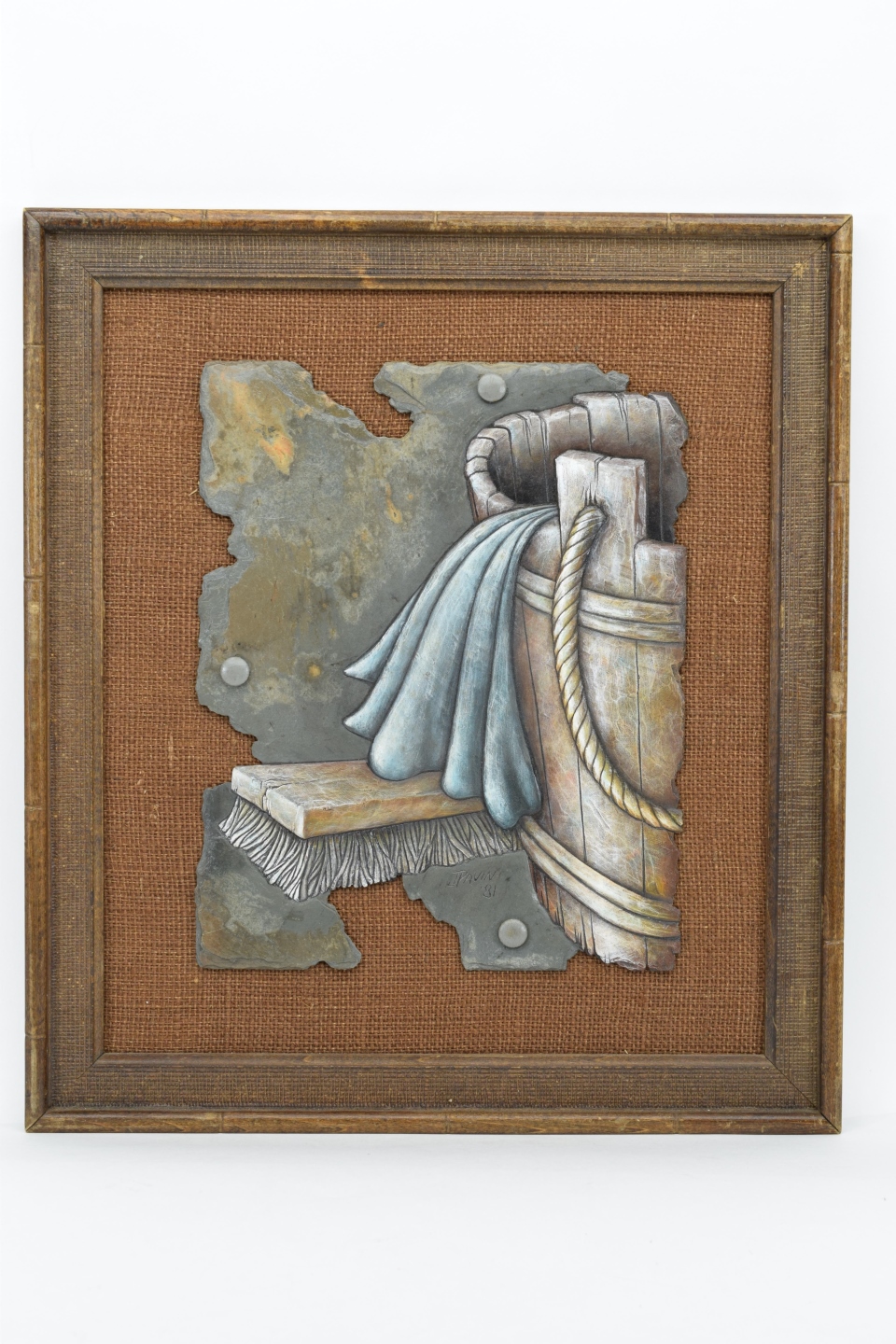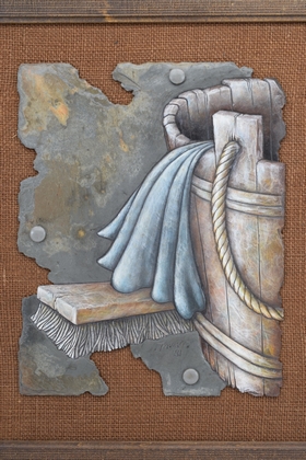 Oil painting on slate depicting a towel draped over a water barrel and brush. Signed “J Pavin 81”. Work measures approx. 12” H x 9-1/2” W x 1/4” D. Frame measures 18-1/2” H x 16-1/4” W x 3/4” D. Weighs approx. 3lbs.