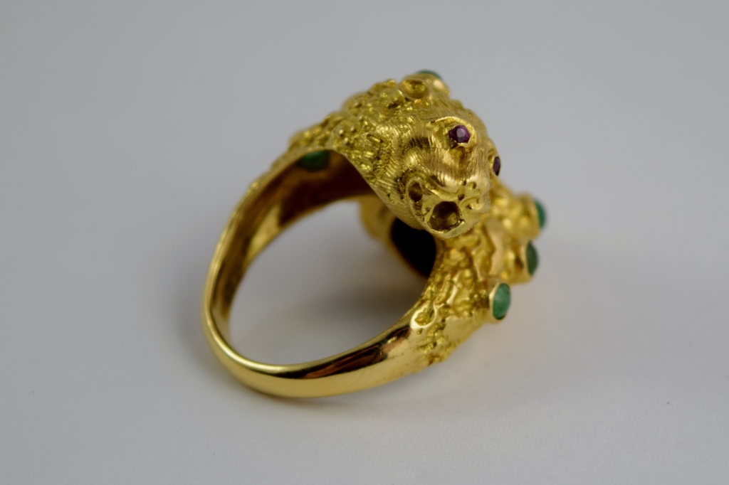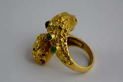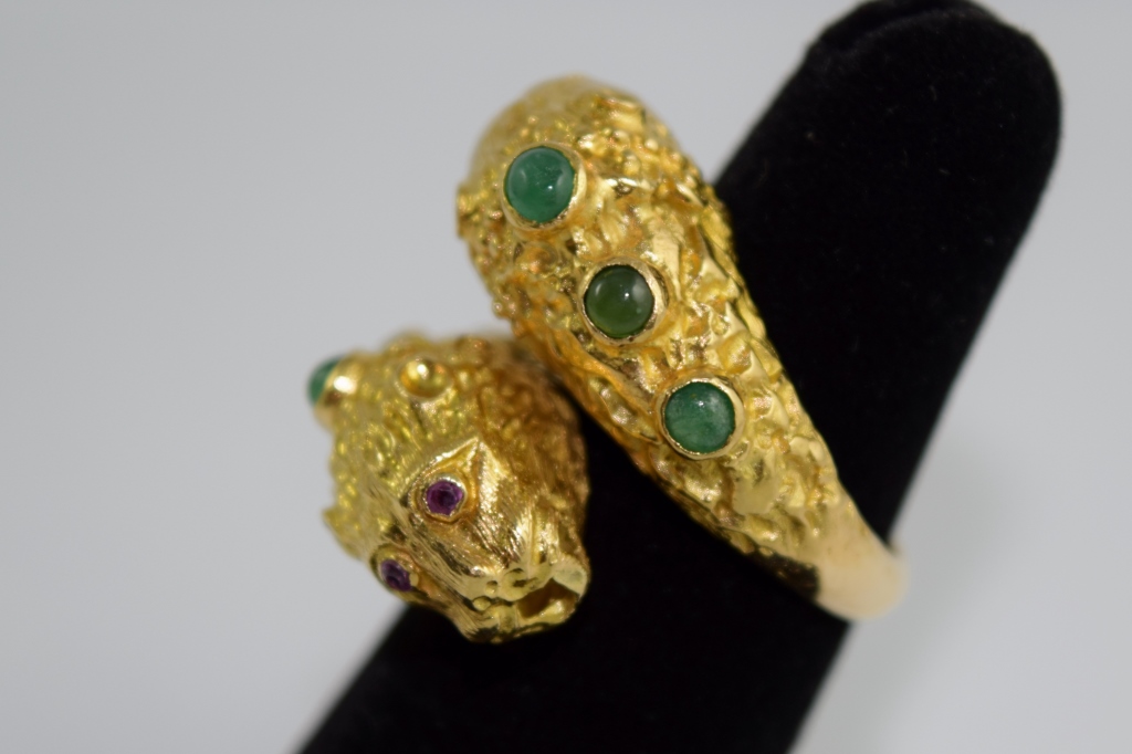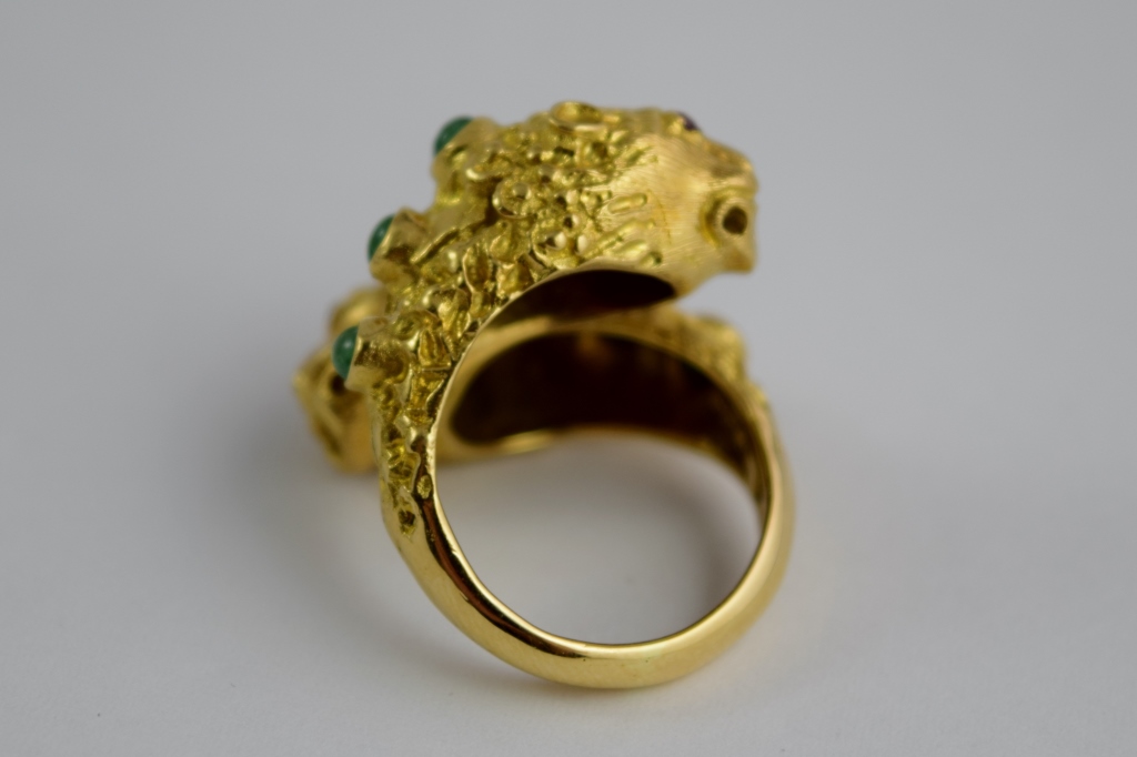 Beautiful 18K chimera ring with ruby eyes and jade or emerald down each back. Hallmarked "B38" and "750". Ring size 6.5 to 7 and slightly ajustable. Face measures 1" H x 1" W. Weighs 16g. Please see lot# 40 for matching ring.