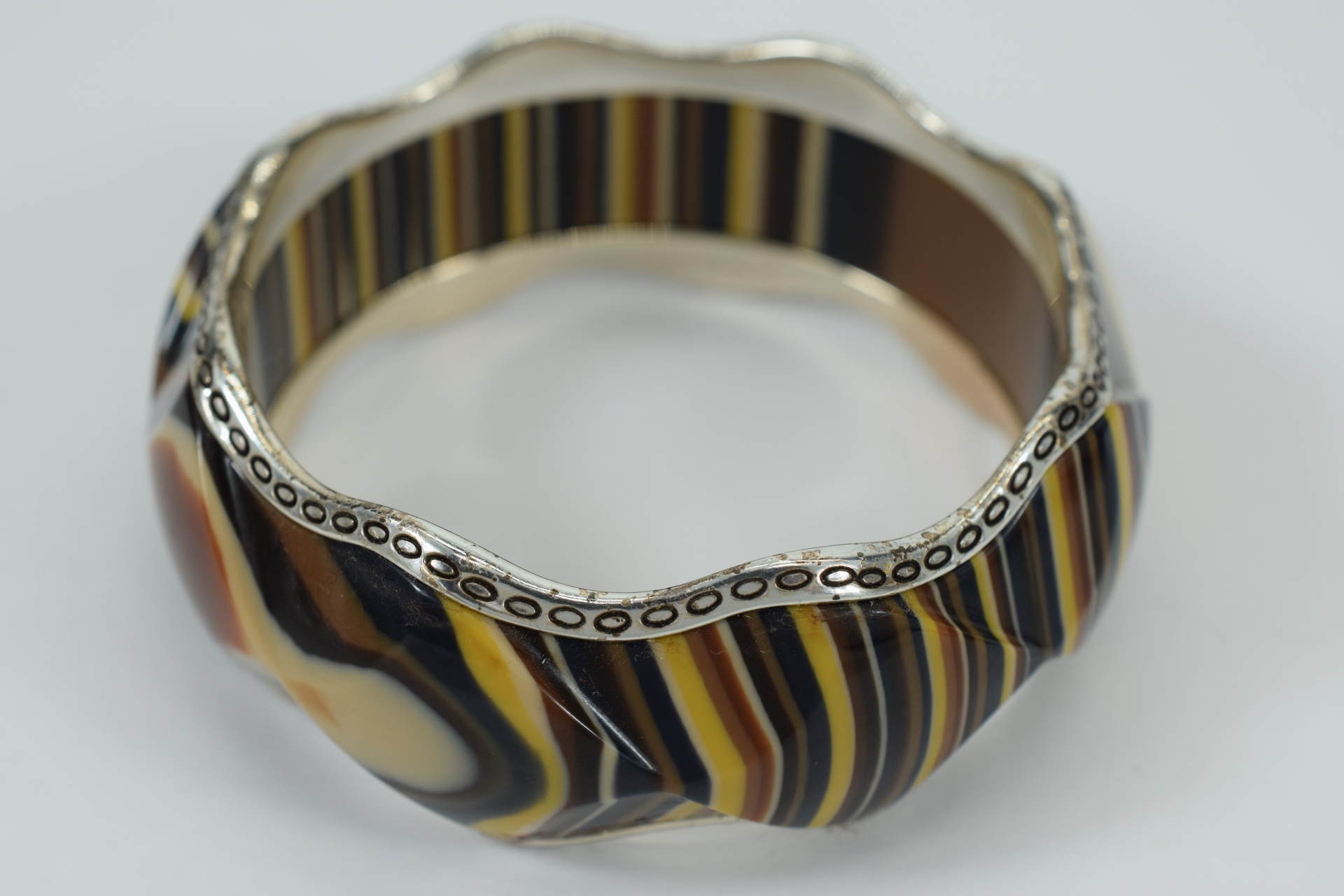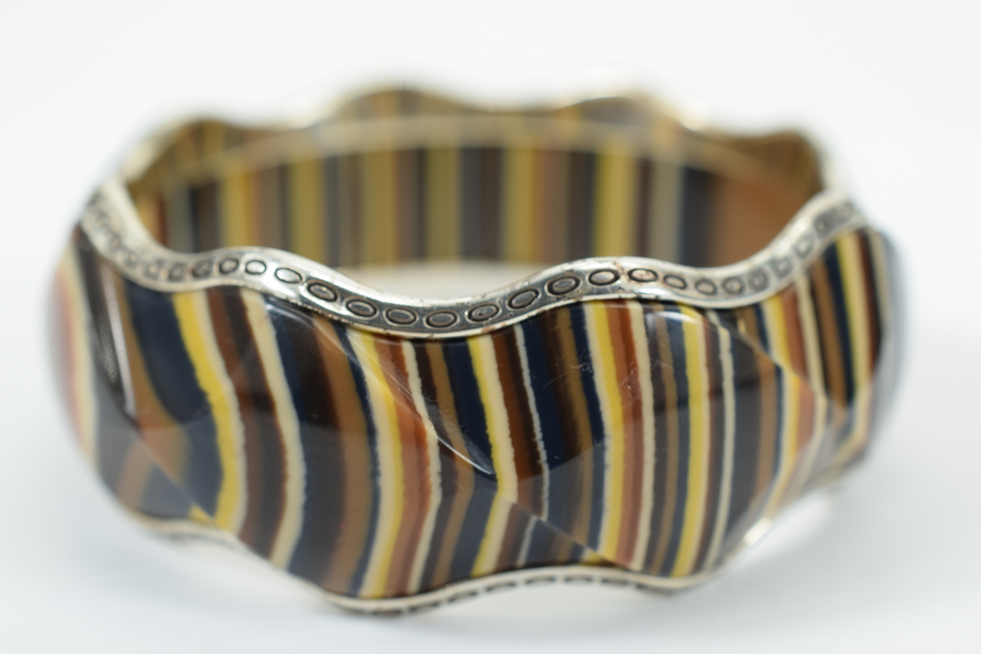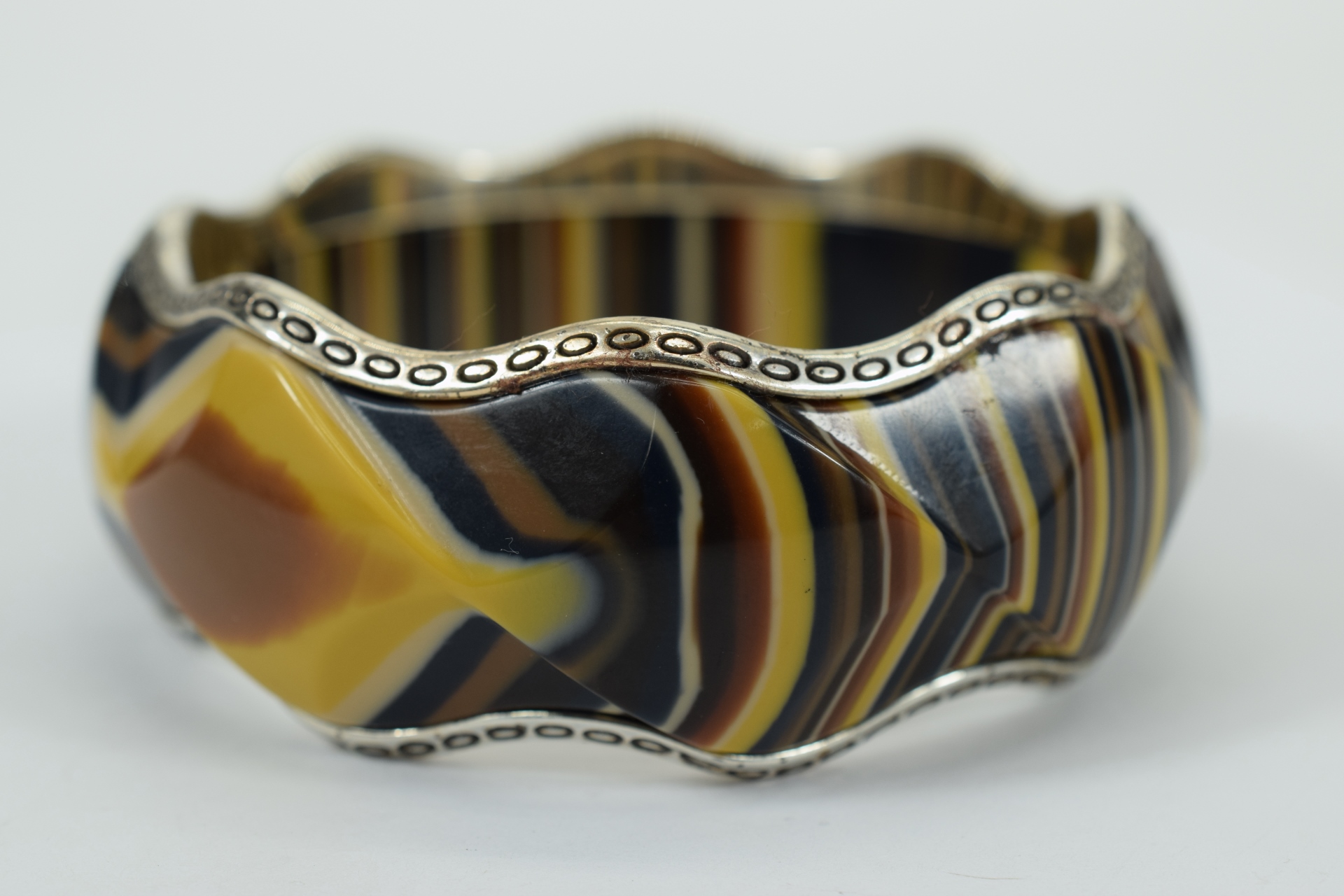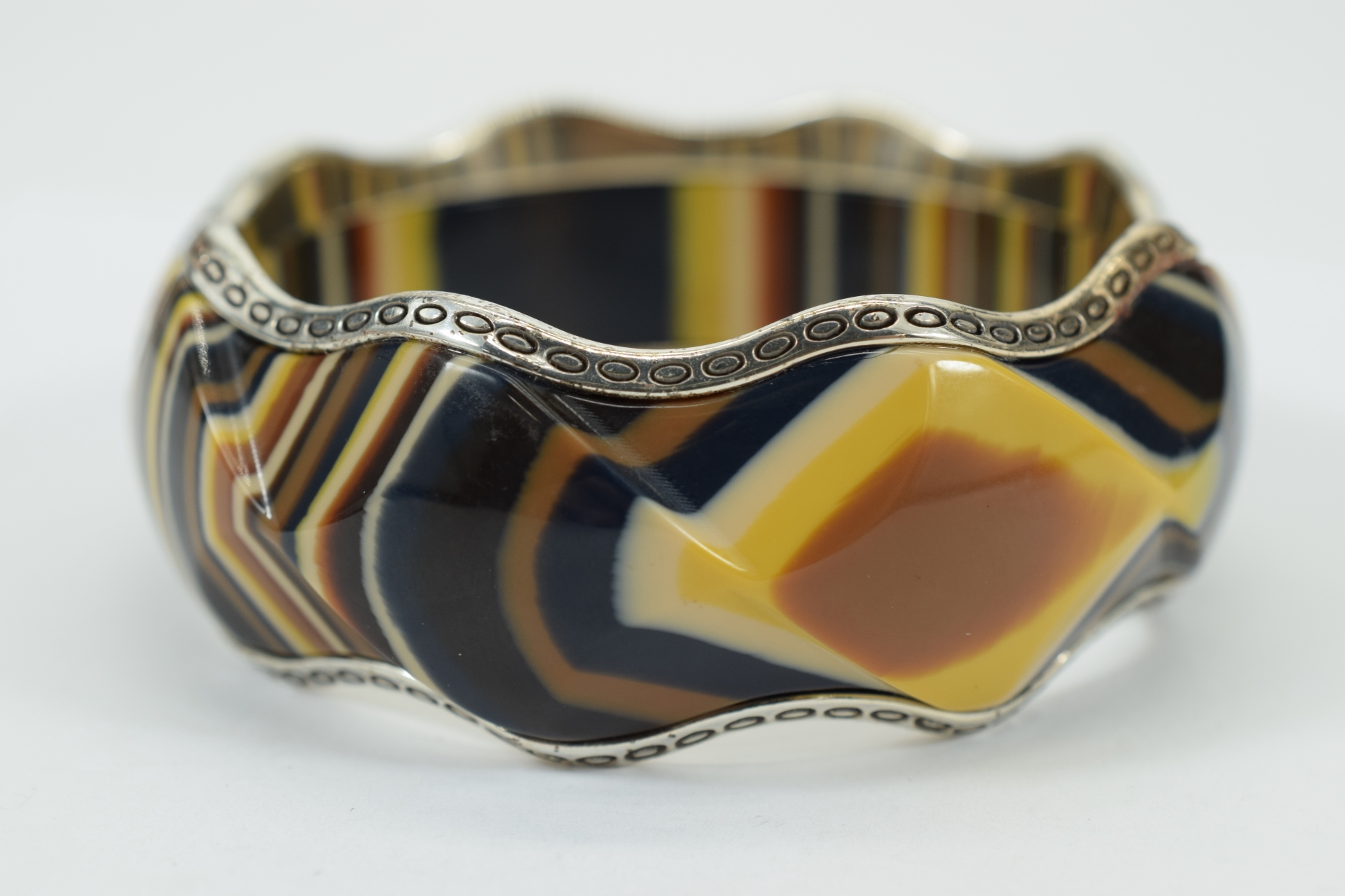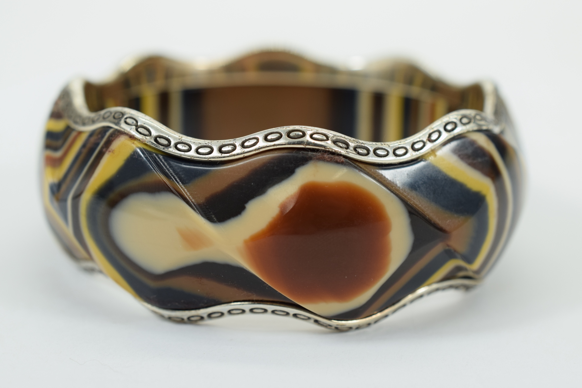 Costume fashion brown, yellow, and cream colored bangle bracelet resembling bakelite. Hallmarked Brighton. Weighs 69g.