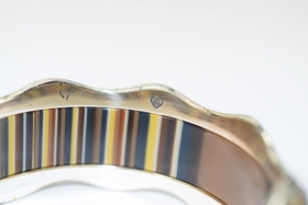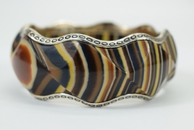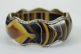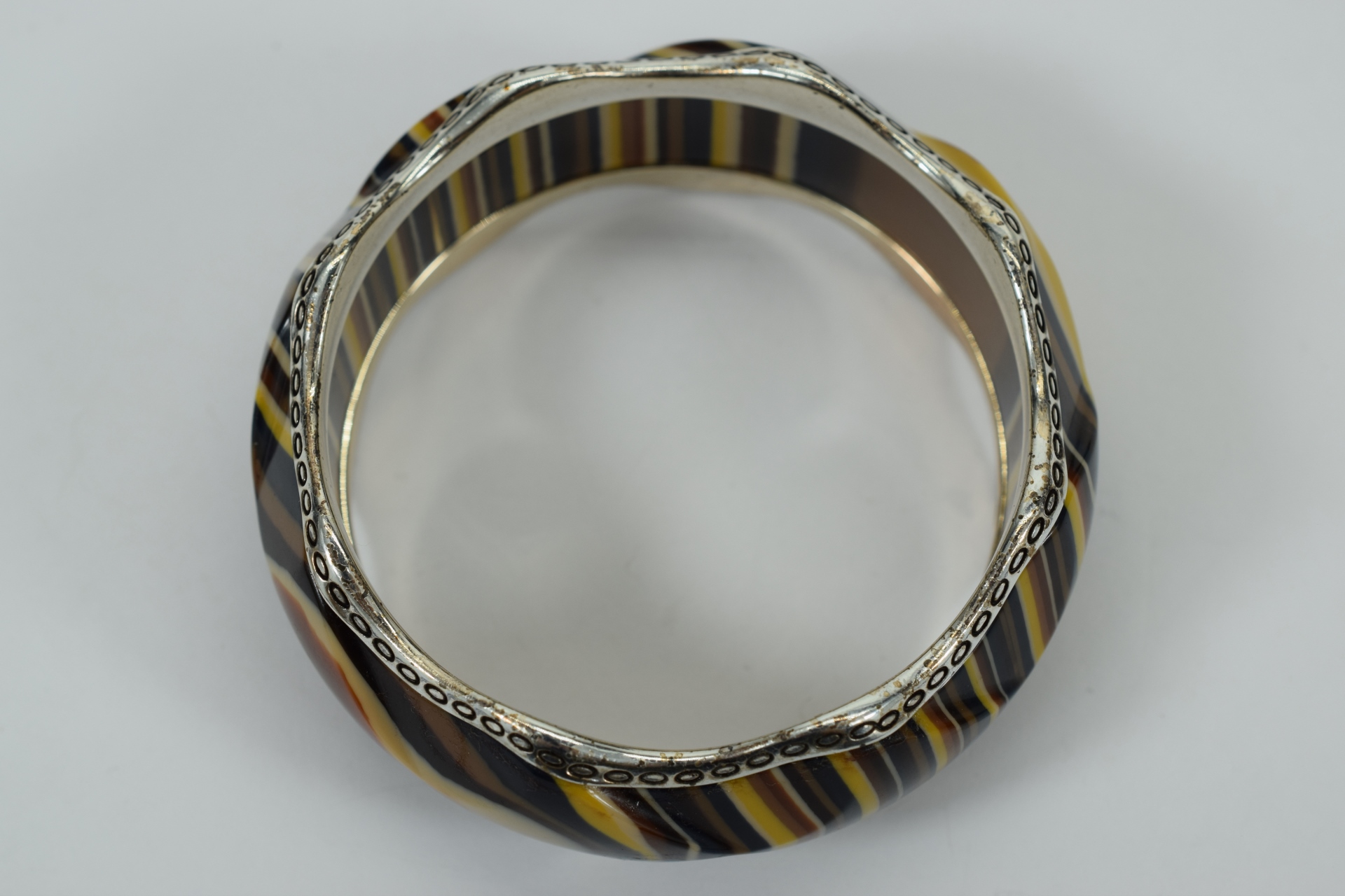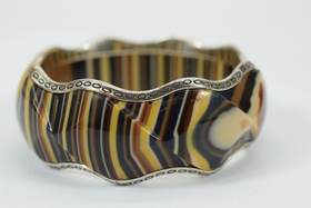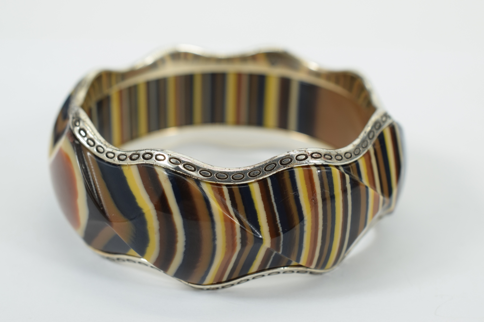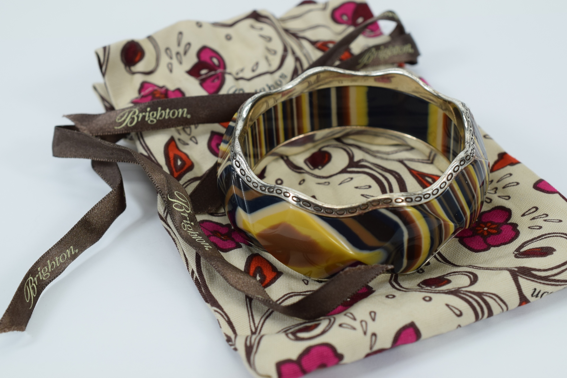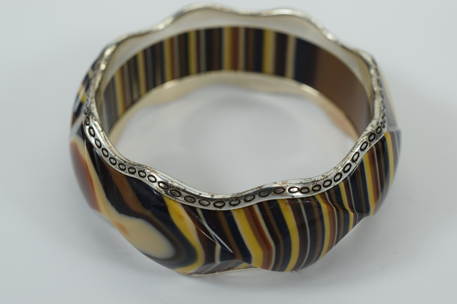Costume fashion brown, yellow, and cream colored bangle bracelet resembling bakelite. Hallmarked Brighton. Weighs 69g.
