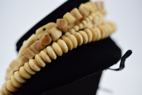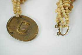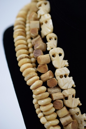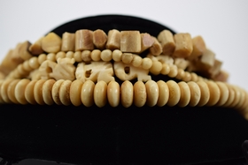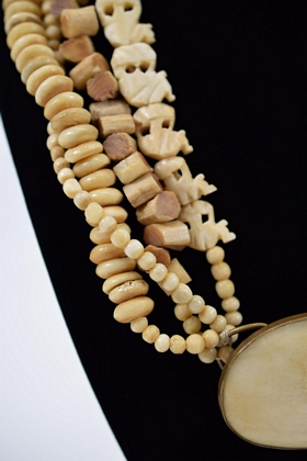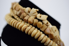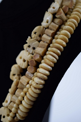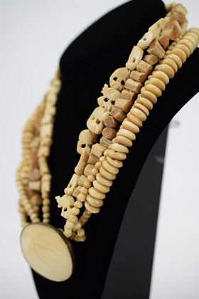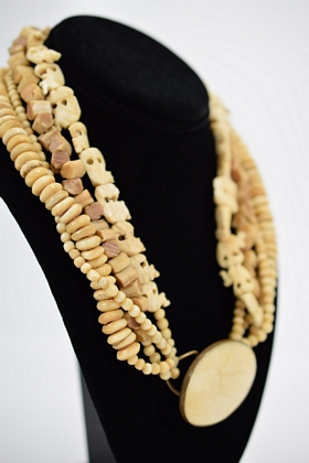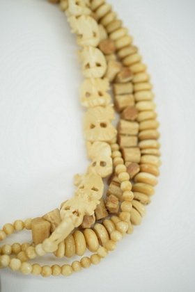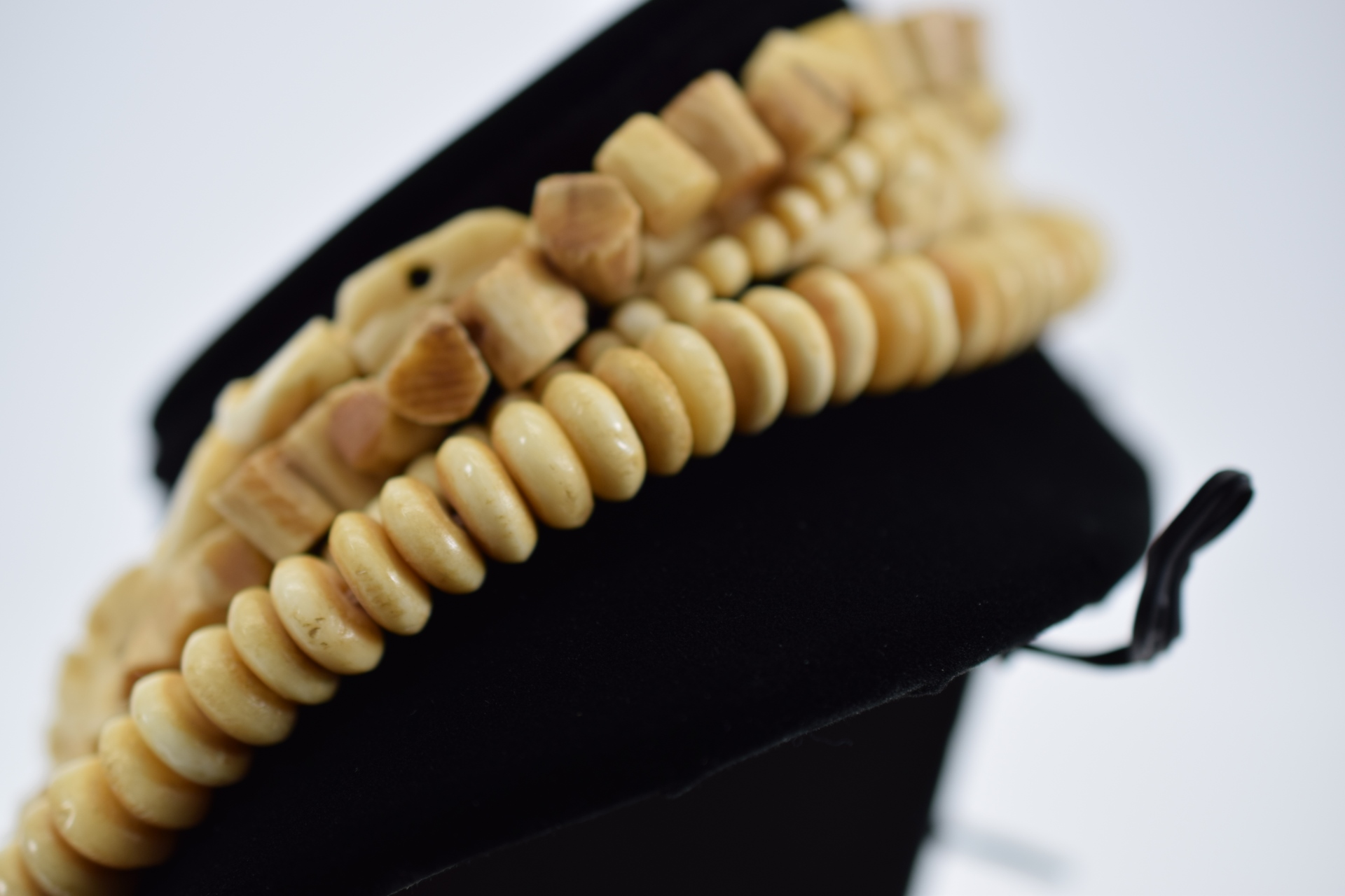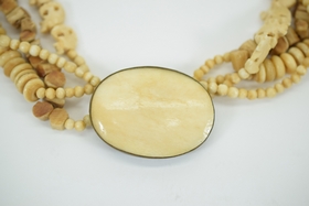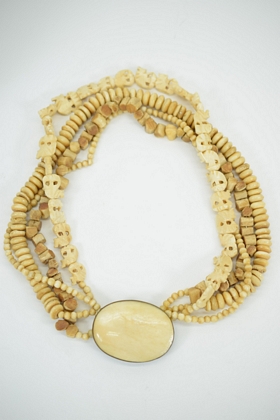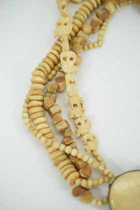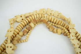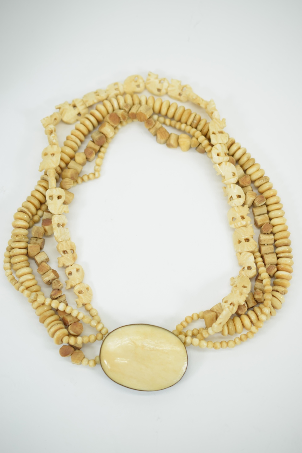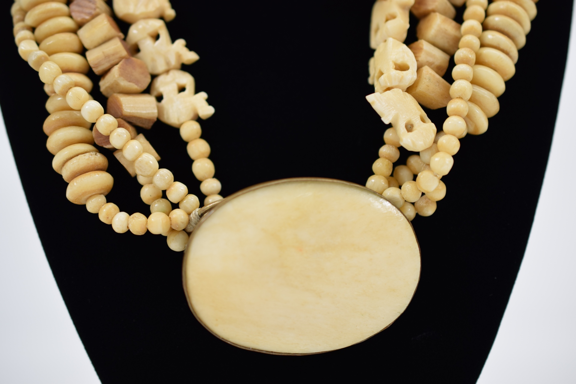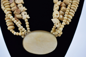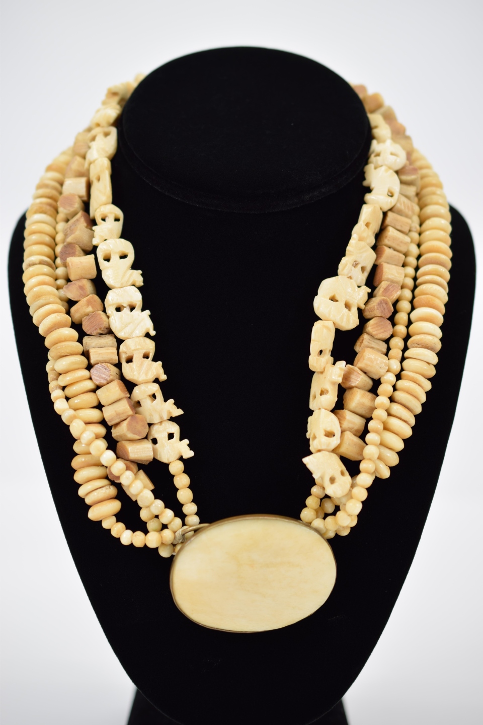 Four individual strands of carved bone in various shapes and/or figures with a larger oval bone pendant. Measures approx. 18” L (plus 2” pendant). Weighs 166.8g.