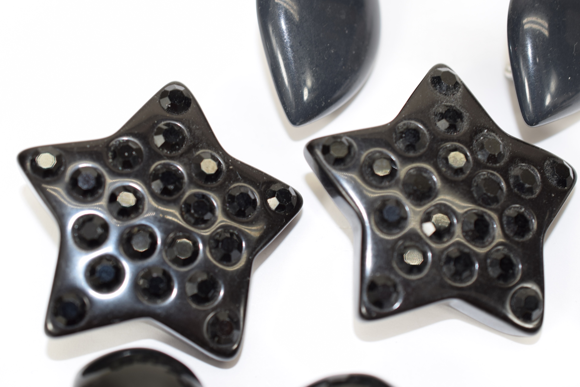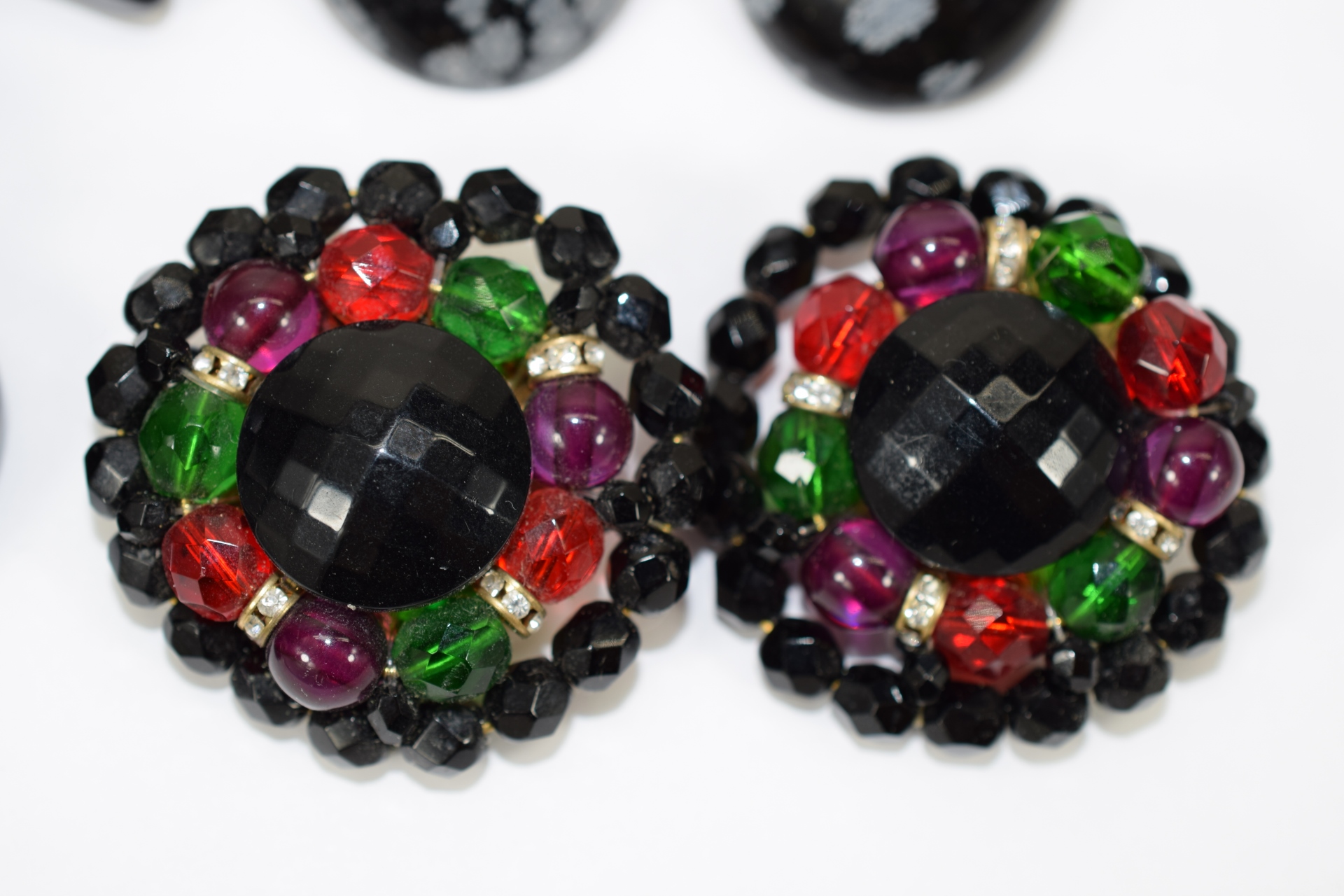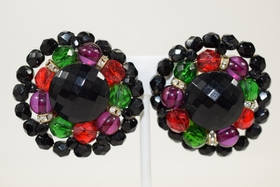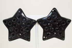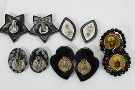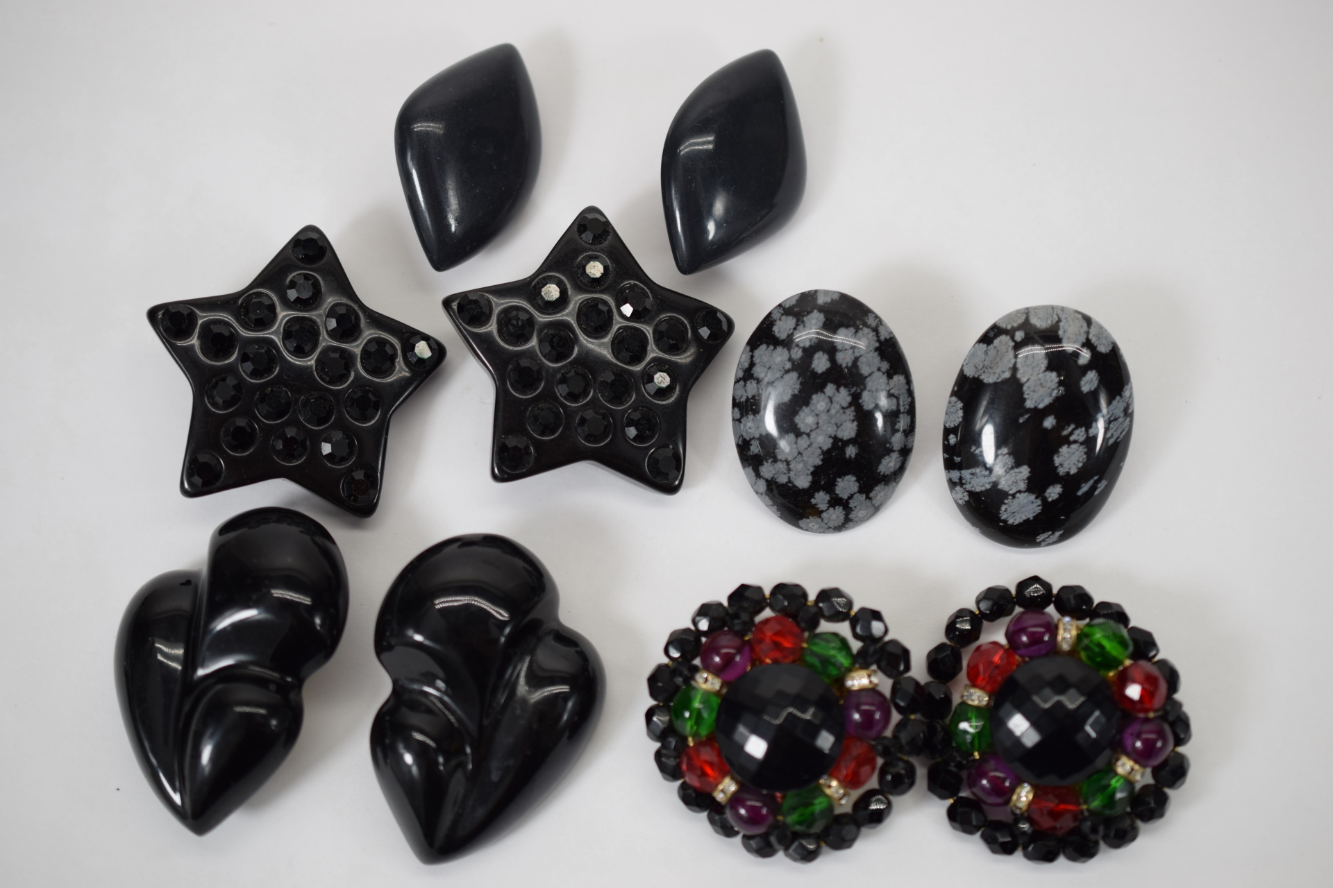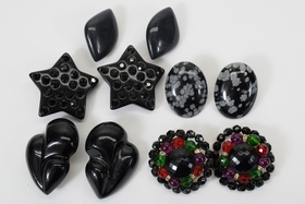 Lot of fashion costume clip-on earrings in various designs including snowflake agate, black stars with rhinestones, large black leaves, black, red, green, and purple beaded, and Monet. Total weight 5.4oz.