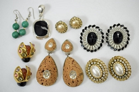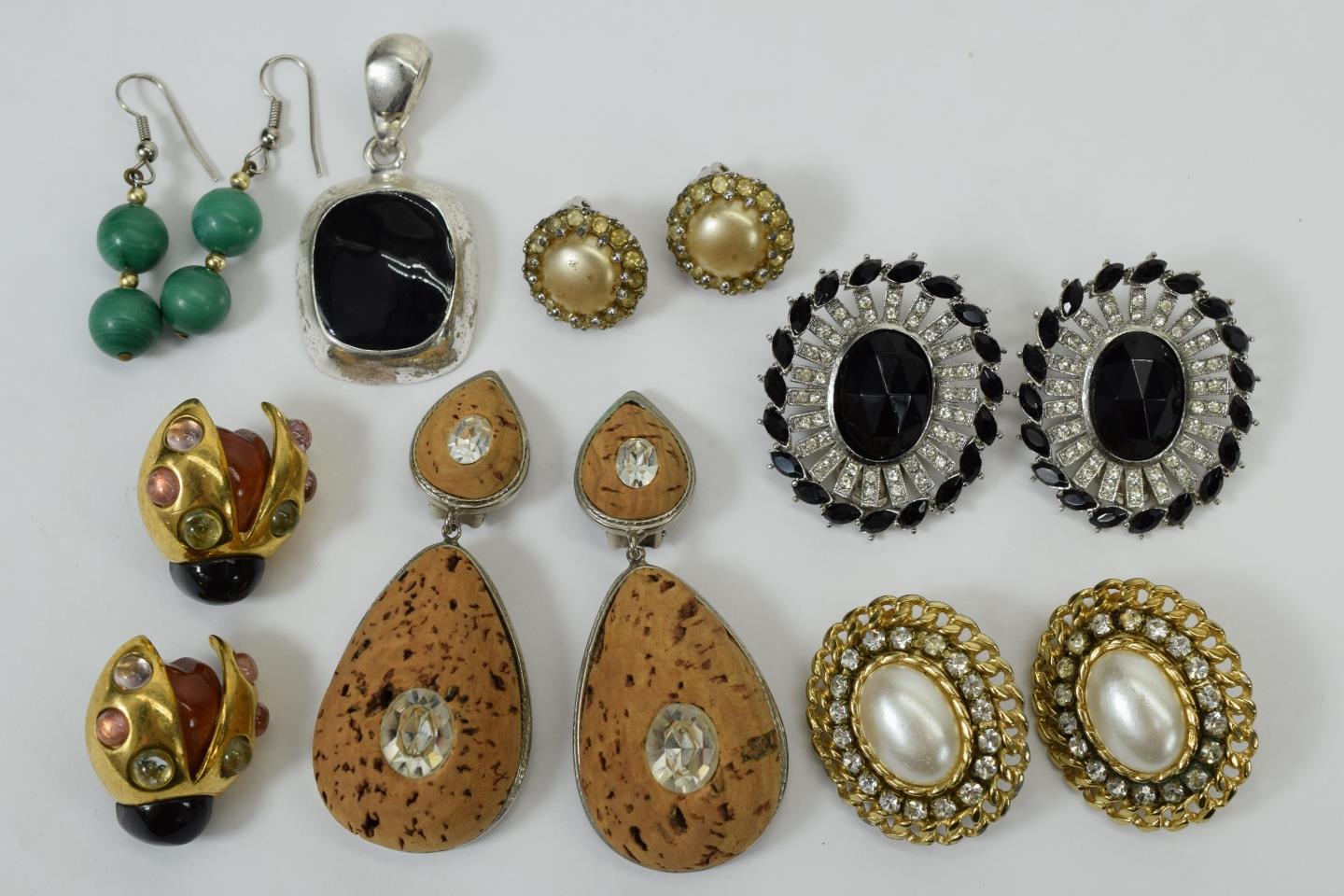 Lot of fashion costume clip-on earrings in various designs including gold tone Cuban link rhinestone pearl earrings, ladybug / or beetles, cork, malachite, and more. Comes with one costume silver and black stone pendant. Total weight 5.07oz.