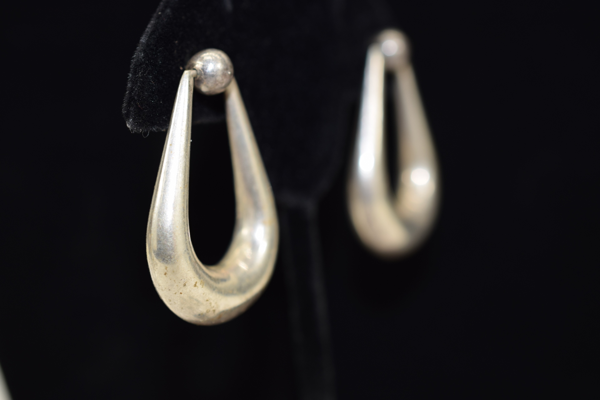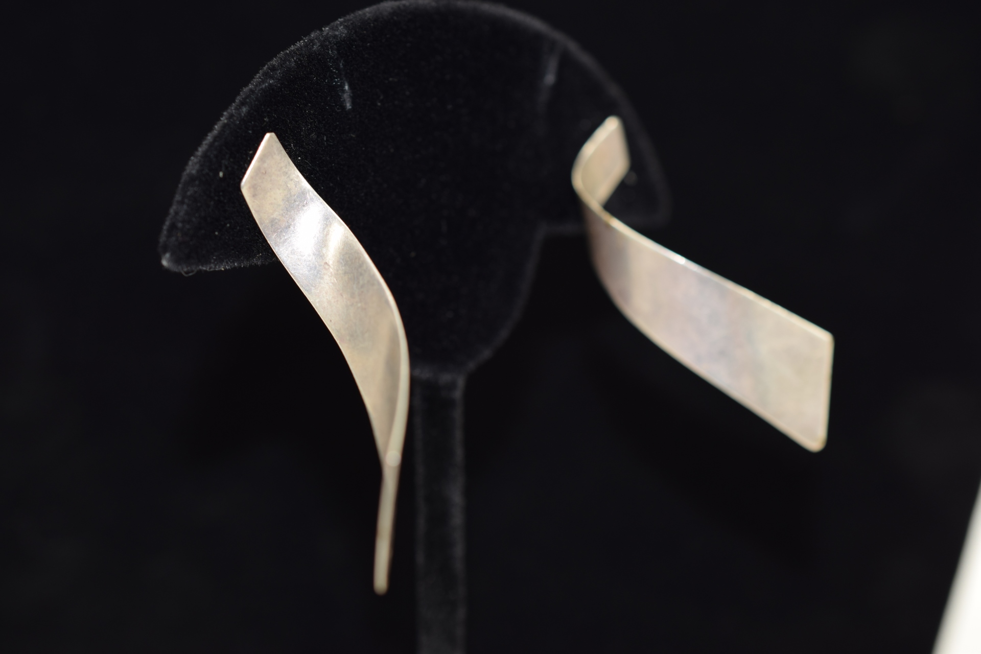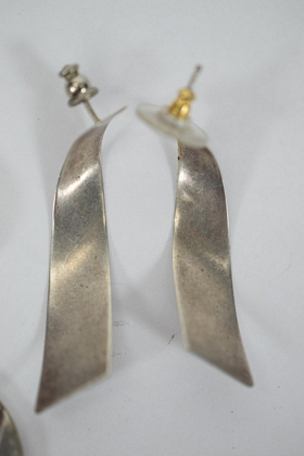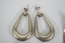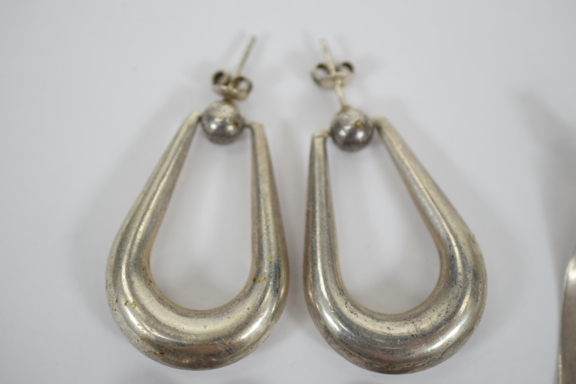 Two pairs of vintage sterling hoops, and one pair of dangle wavy earrings. Total weight 17g.