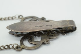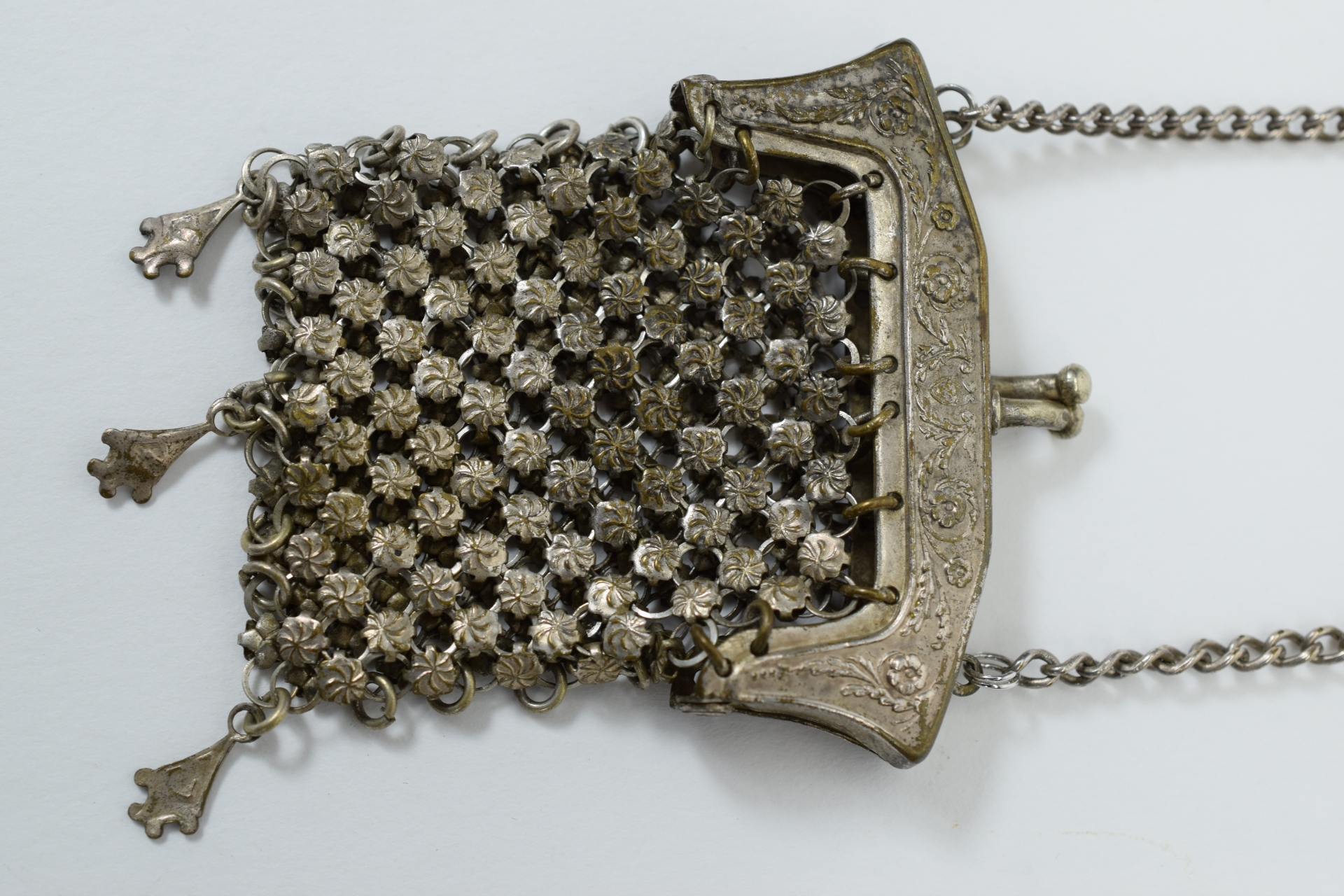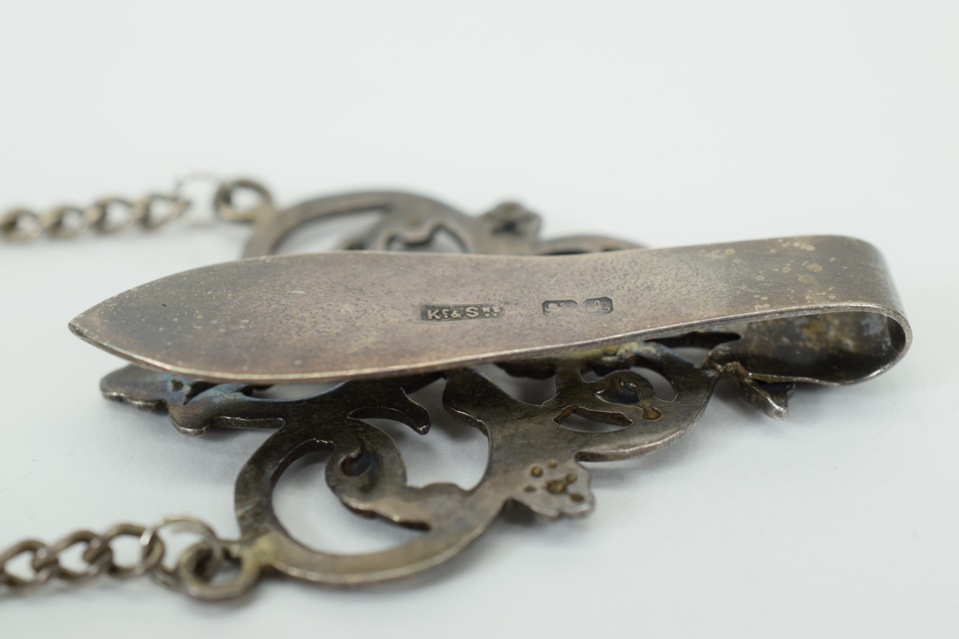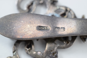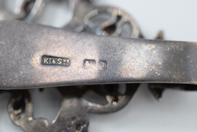 Belt clip is sterling with English hallmarks that appear to be “K.c & S”, a “lion passant” facing left, and a cursive “A” date mark. Purse itself appears to be German silver/silver-plate. Weighs 56.7g.