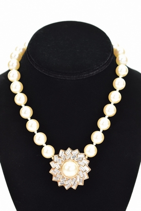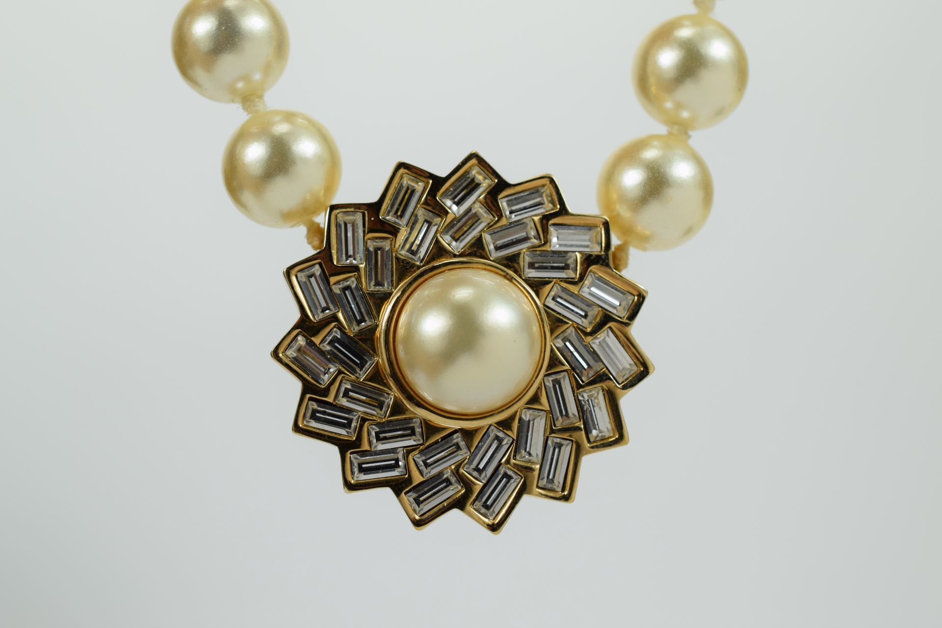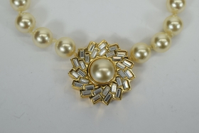 Gold tone pearl necklace with a sunburst rhinestone and pearl pendant. Clasp closure also encrusted with clear rhinestones. Hallmarked “S.A.L.”. Measures approx. 16” L and weighs 111.5g.