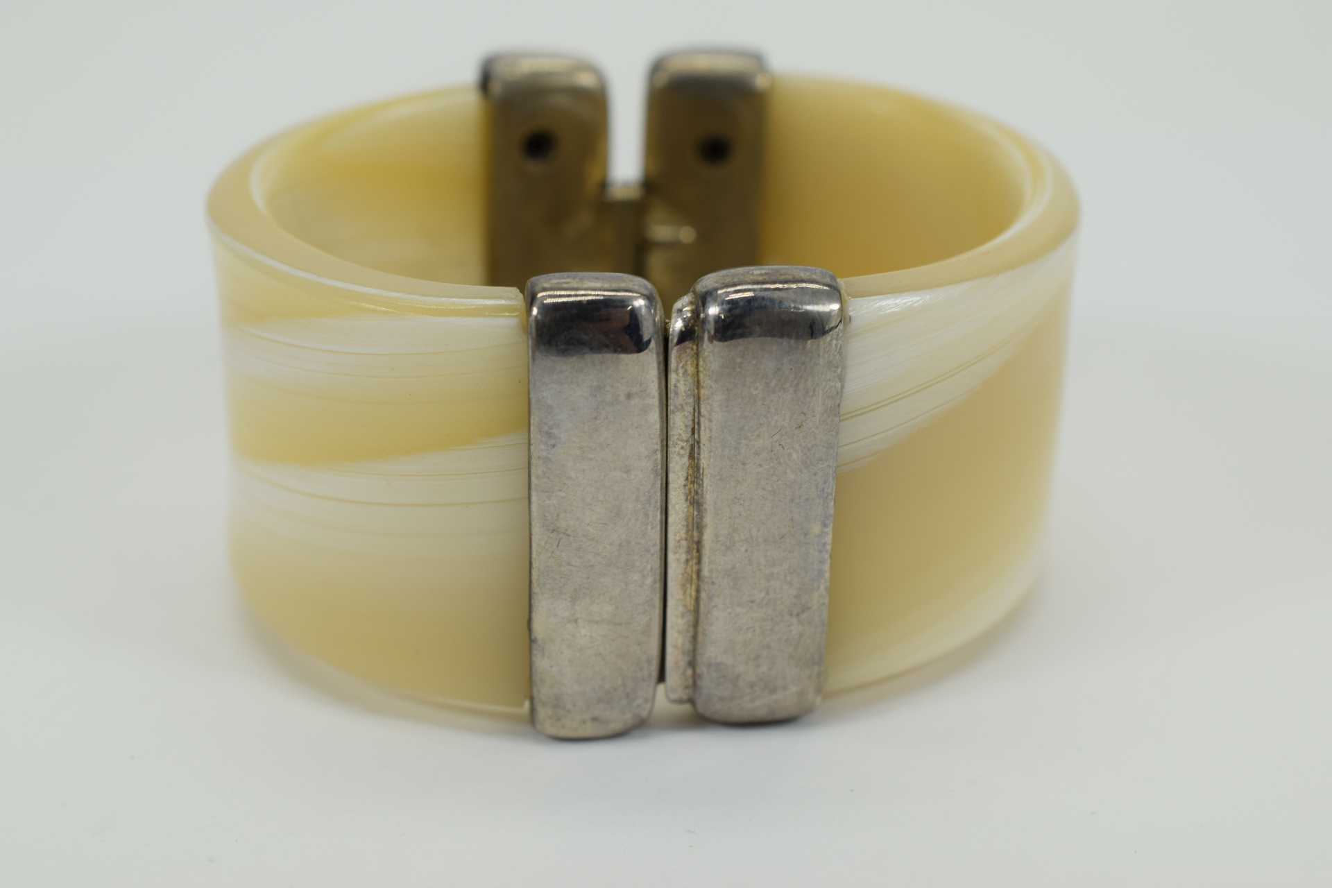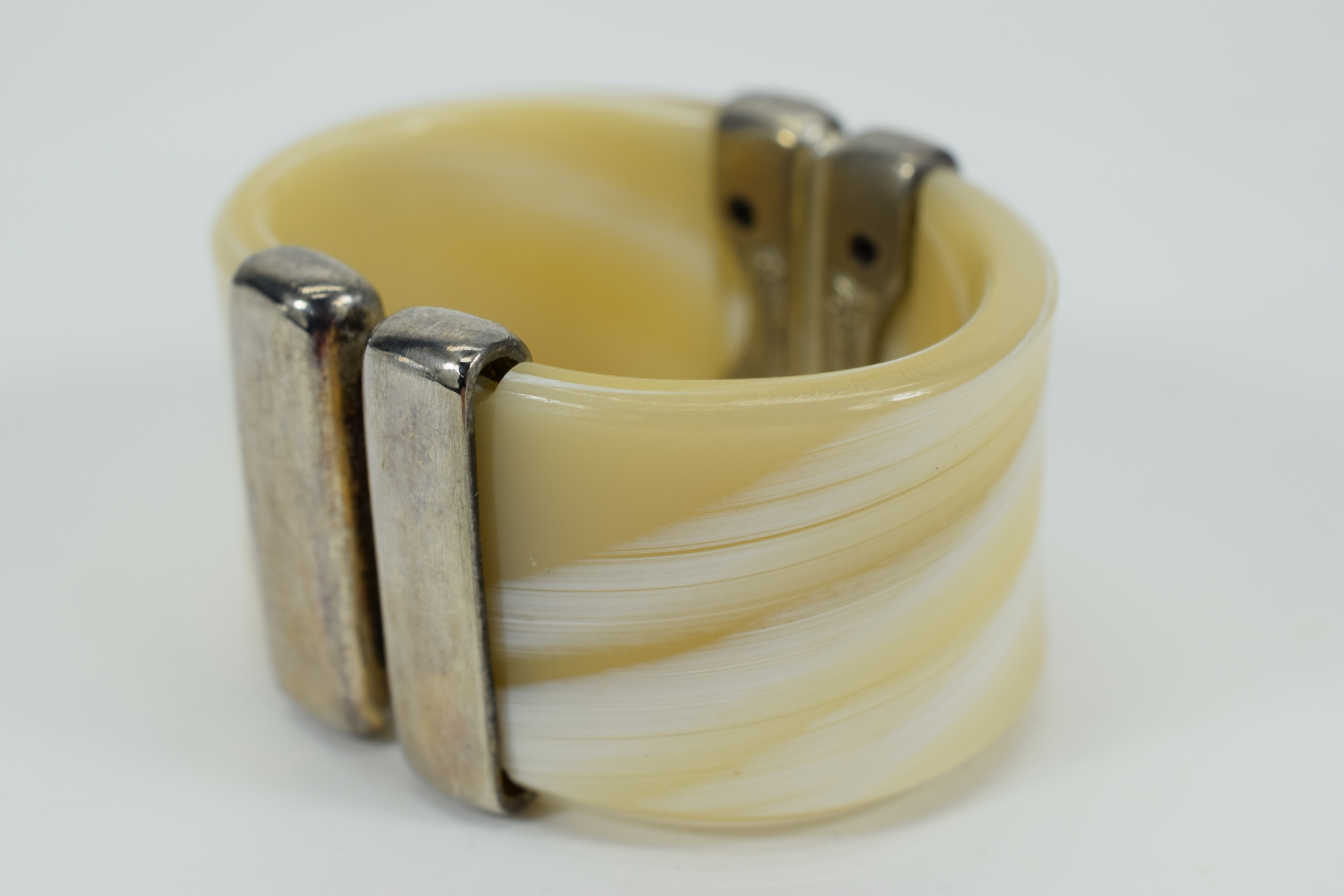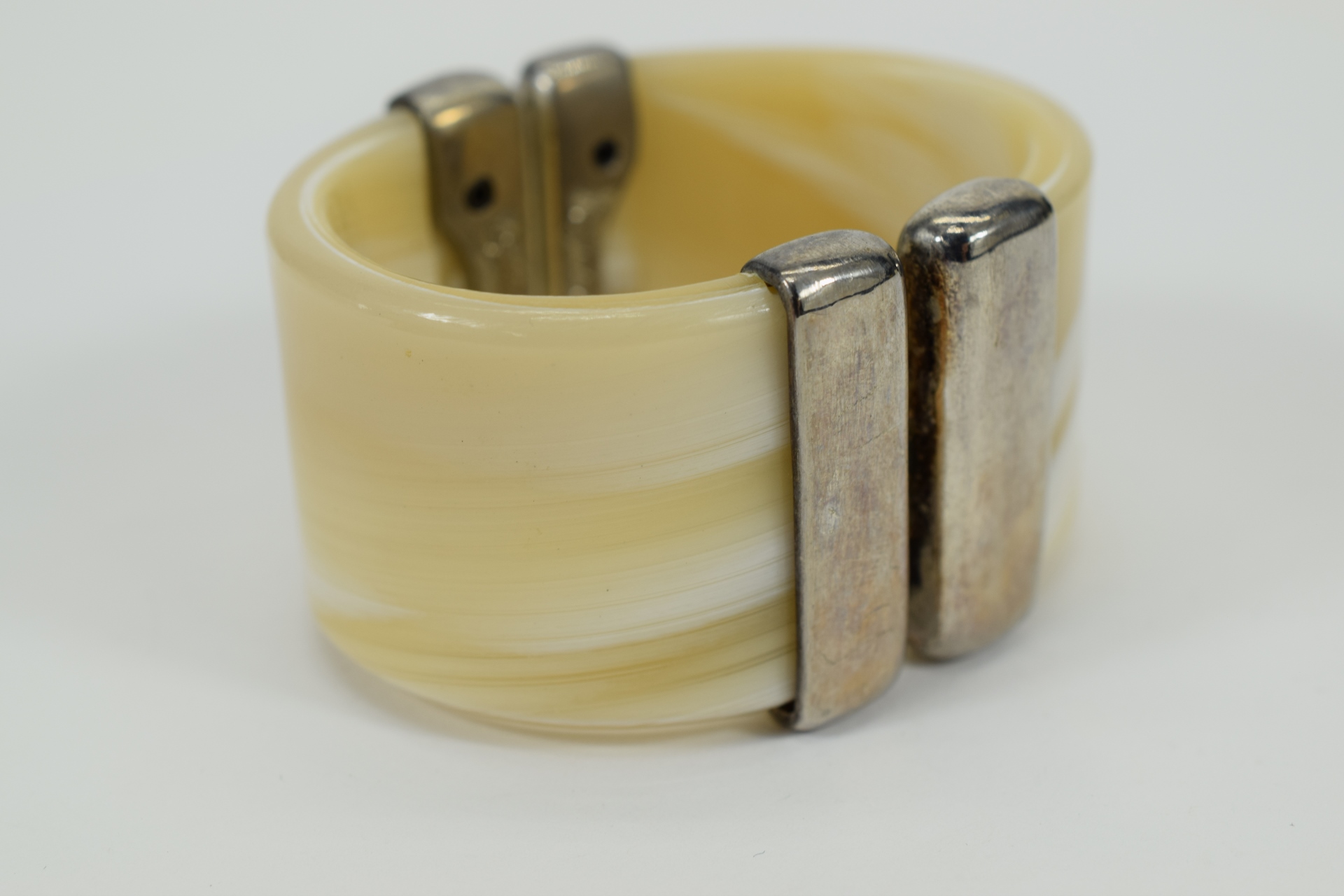Vintage bone and silver cuff bracelet hallmarked “Asymmetry”. Measures approx. 8” L and weighs 89.6g.