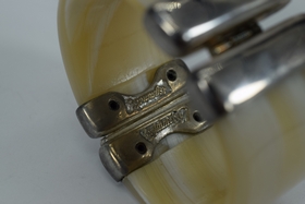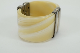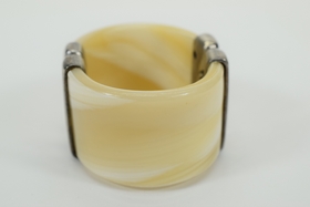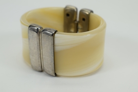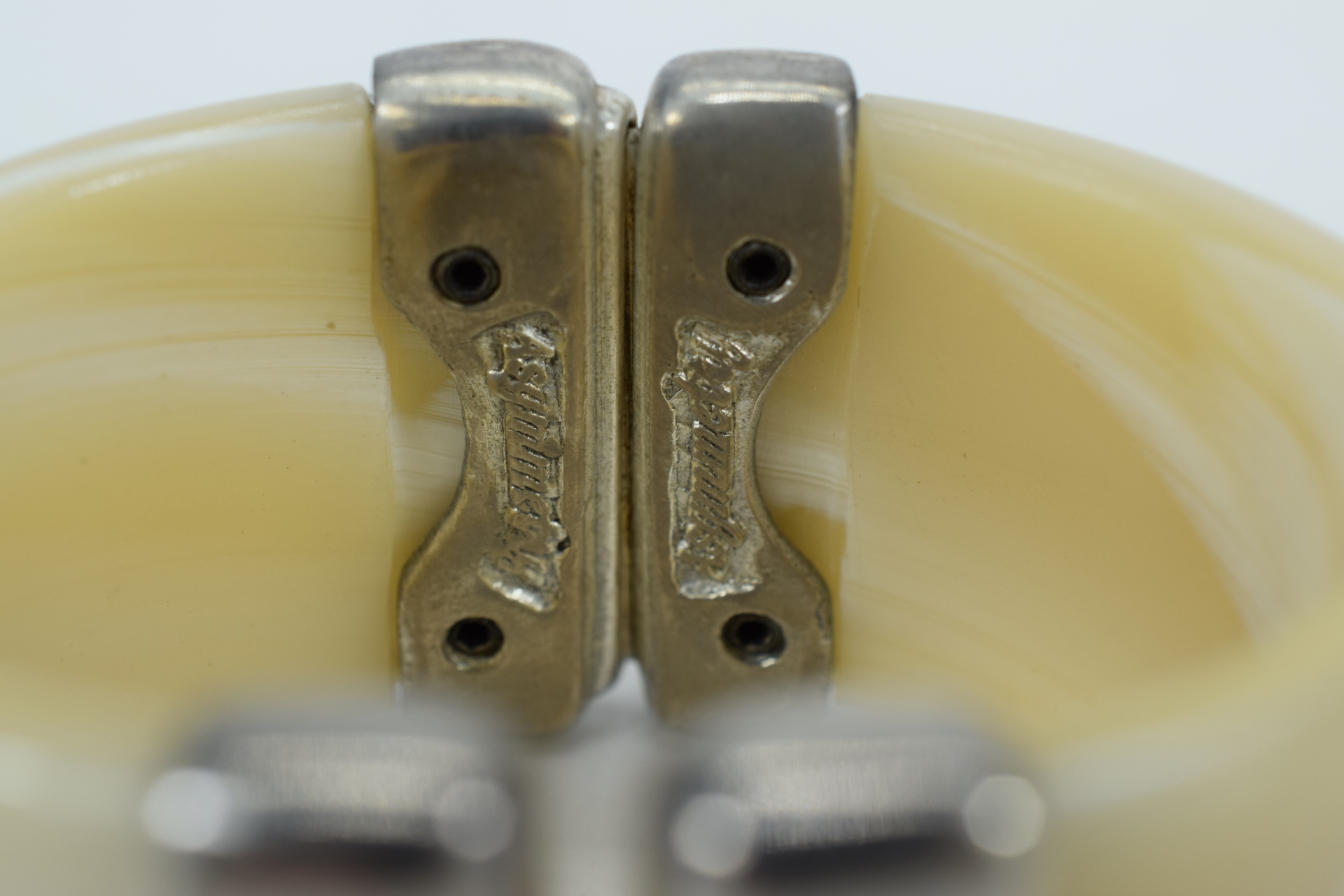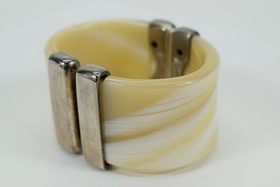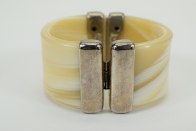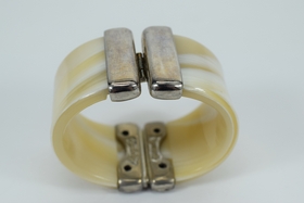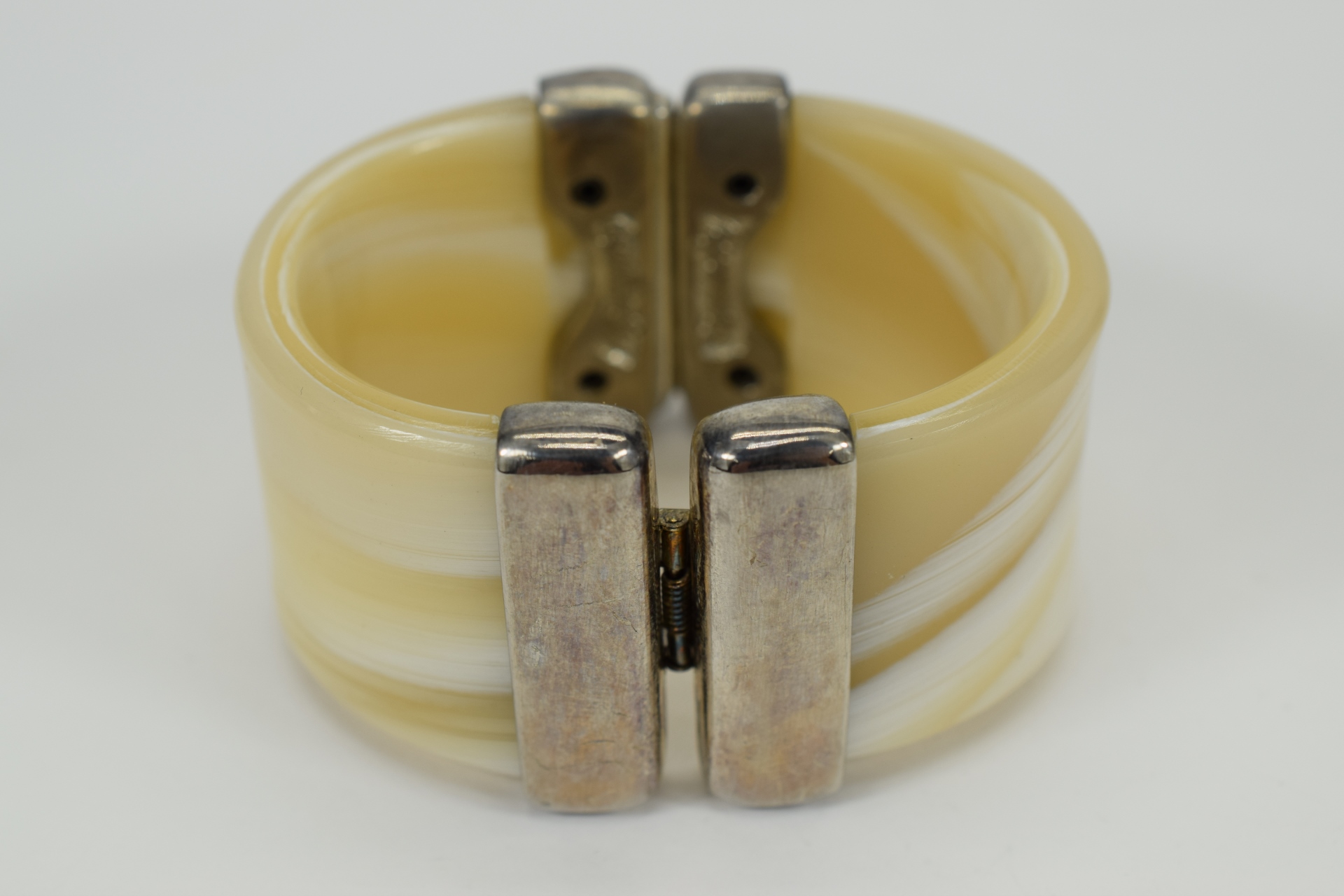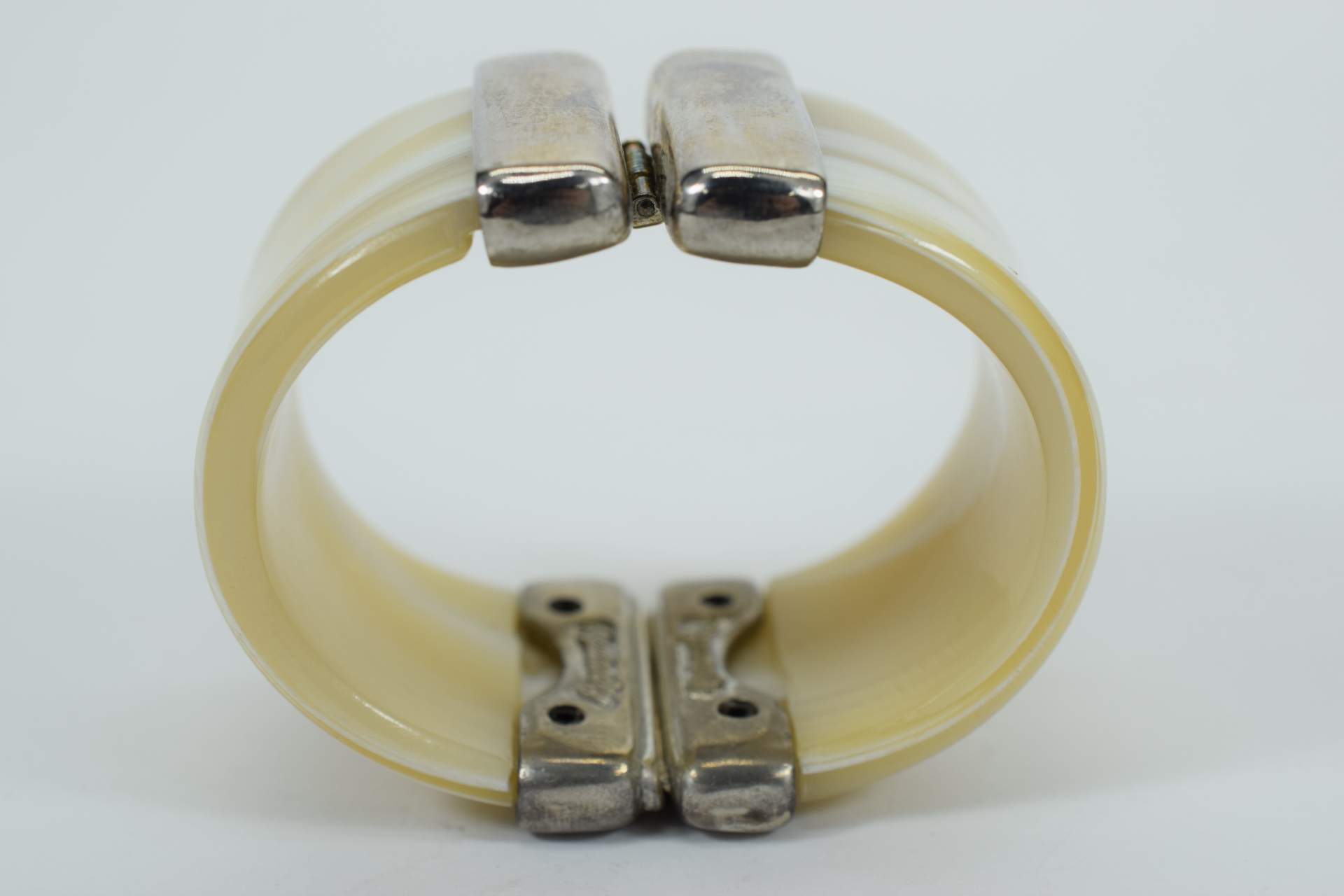 Vintage bone and silver cuff bracelet hallmarked “Asymmetry”. Measures approx. 8” L and weighs 89.6g.