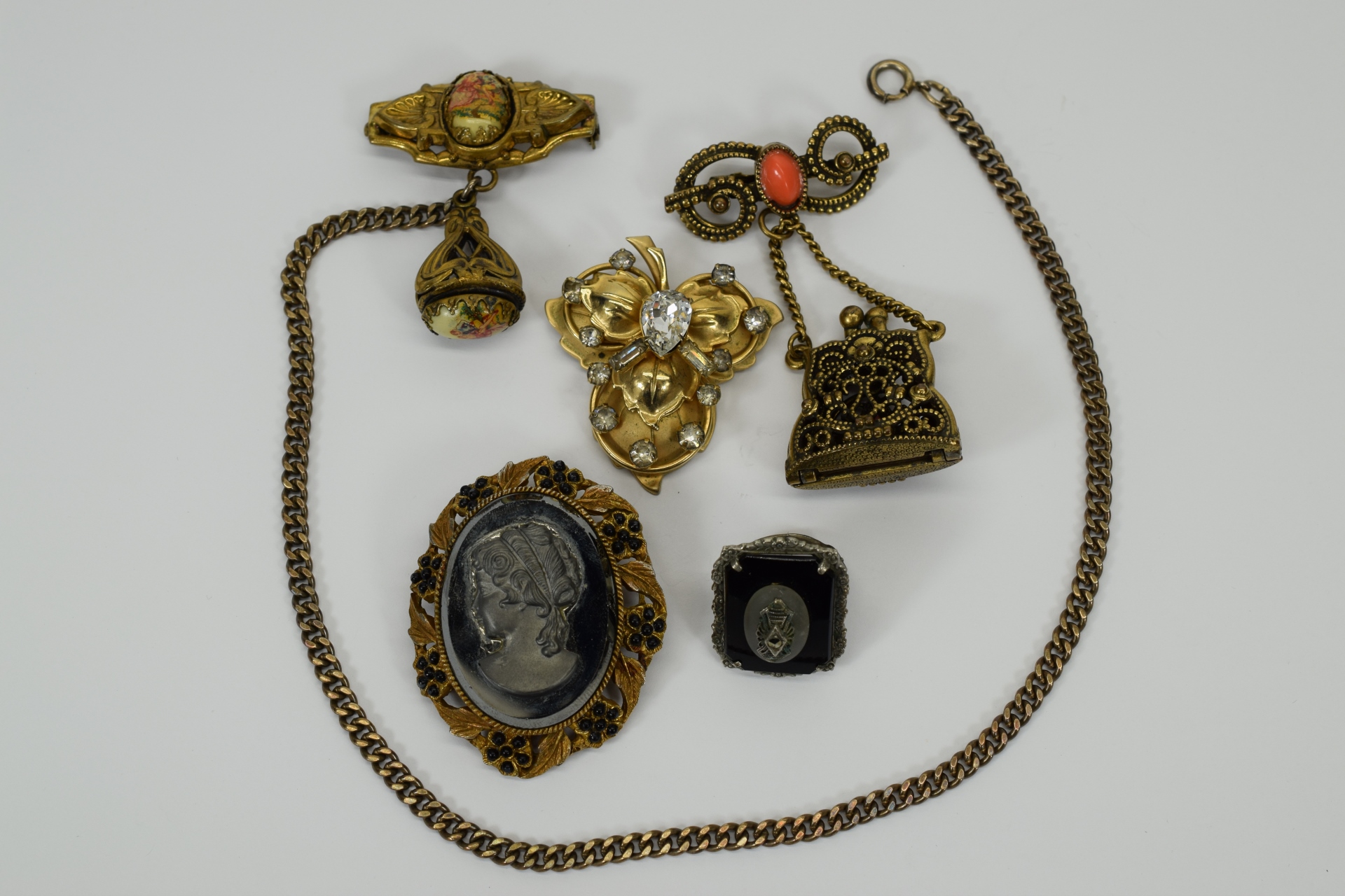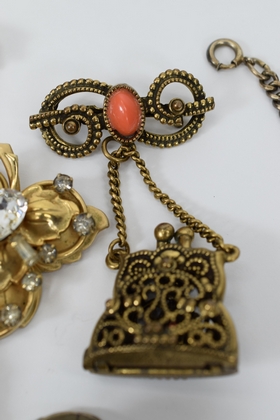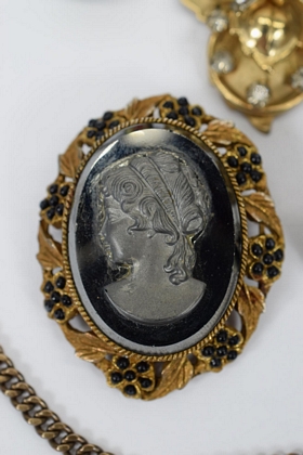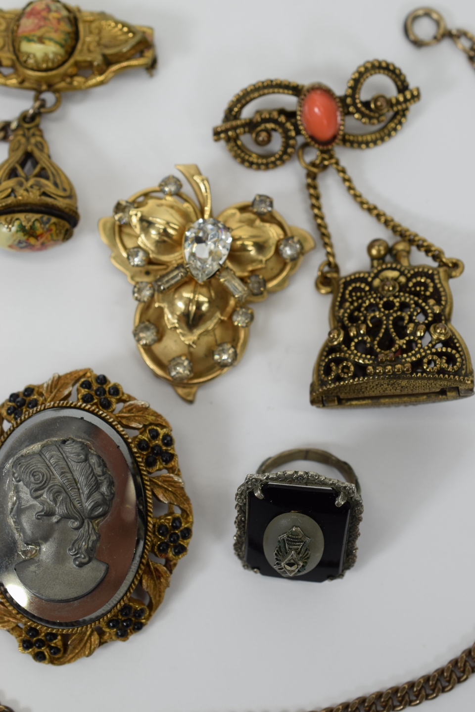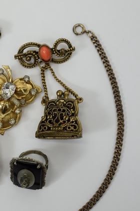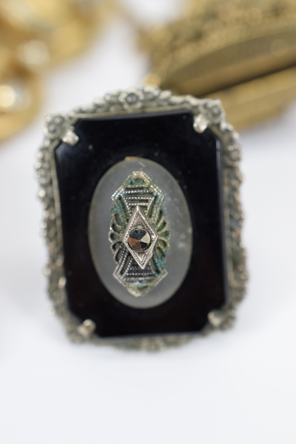 Mixed lot of costume, designer, and sterling pieces including a scent brooch with simulated coral, sterling silver art deco ring with black onyx and marcasite to top center (size 6), gold tone and rhinestone leaf brooch, Karu Fifth Avenue scent brooch with a chain attached, and a framed brass cameo brooch. Total weight 110.2g.