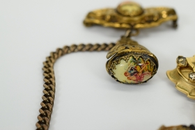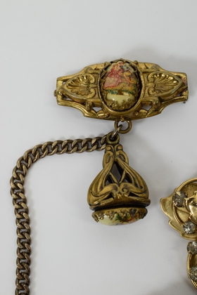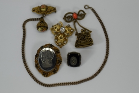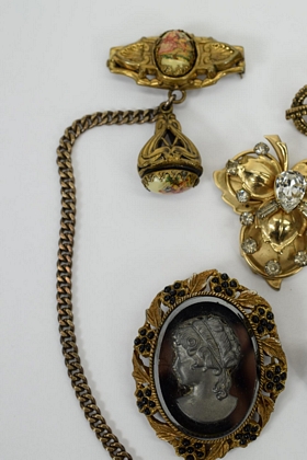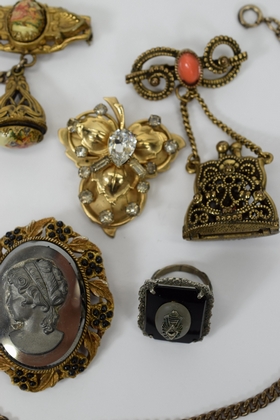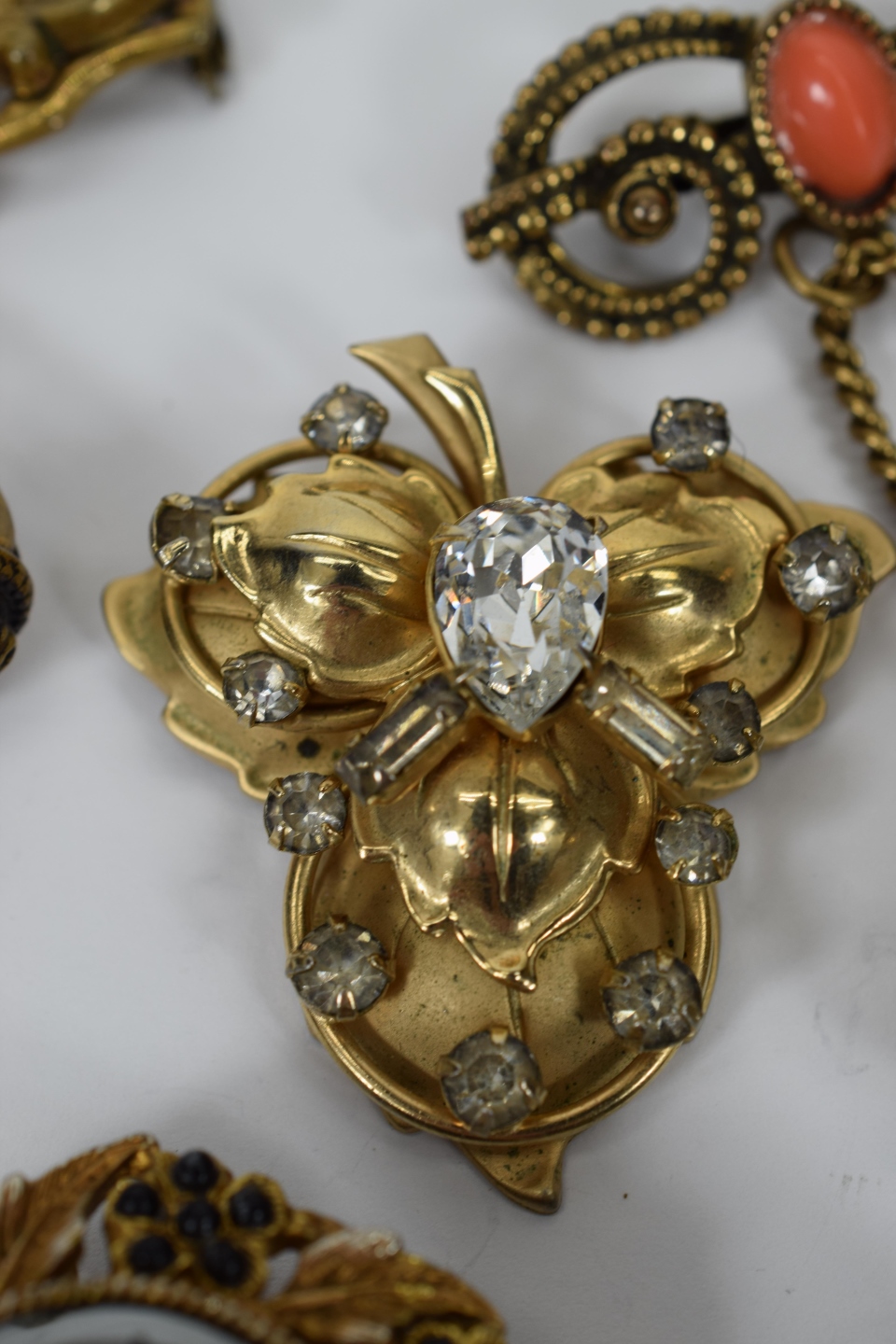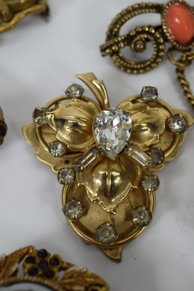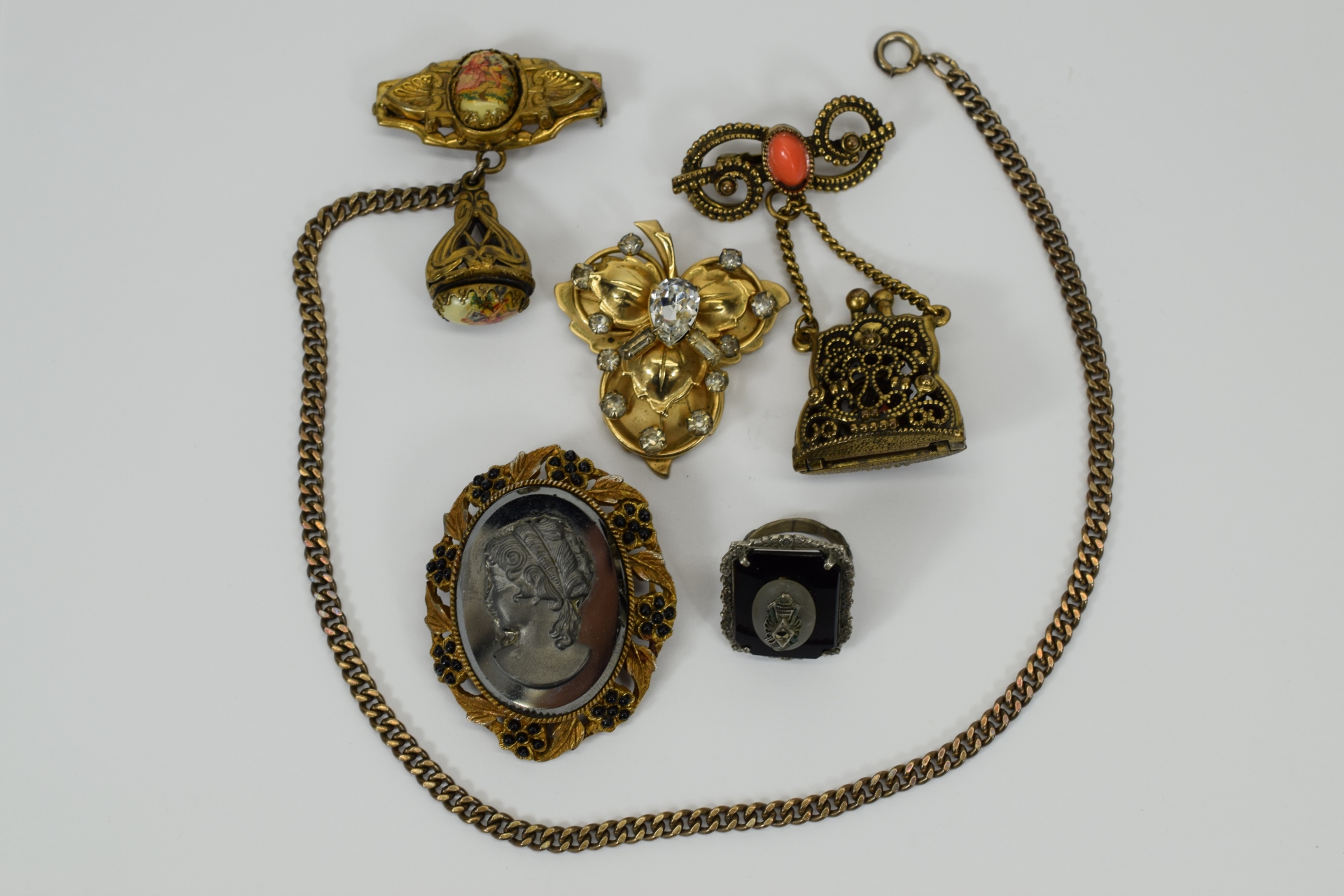 Mixed lot of costume, designer, and sterling pieces including a scent brooch with simulated coral, sterling silver art deco ring with black onyx and marcasite to top center (size 6), gold tone and rhinestone leaf brooch, Karu Fifth Avenue scent brooch with a chain attached, and a framed brass cameo brooch. Total weight 110.2g.